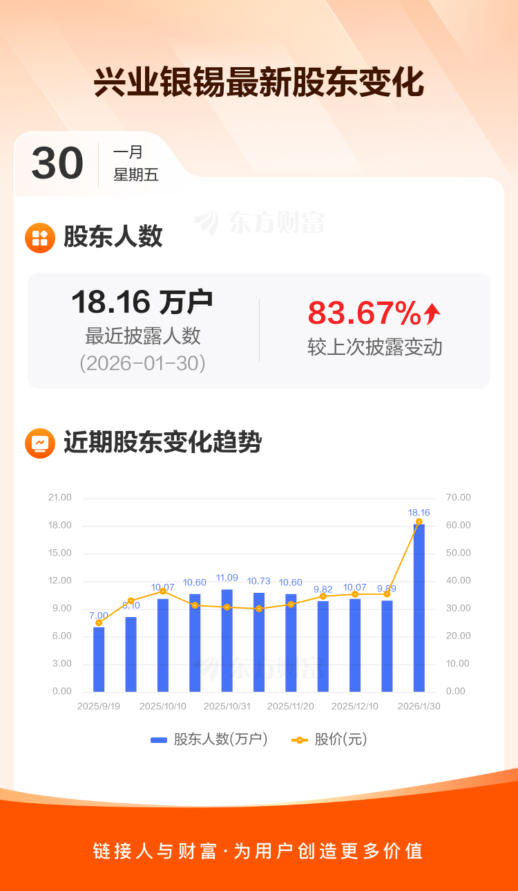 兴业银锡:截至1月30日最新股东户数18.16万户,较上期增加83.67%
