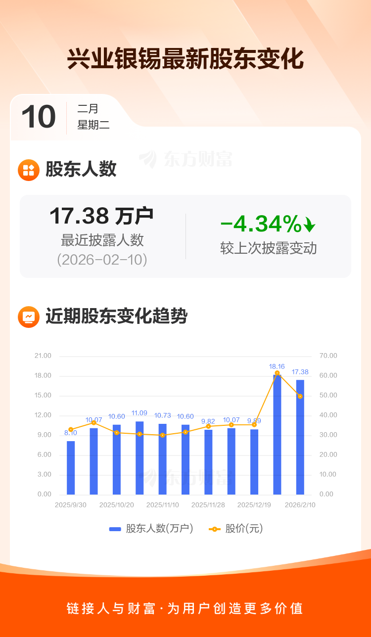 兴业银锡:截至2月10日最新股东户数17.38万户,较上期减少4.34%