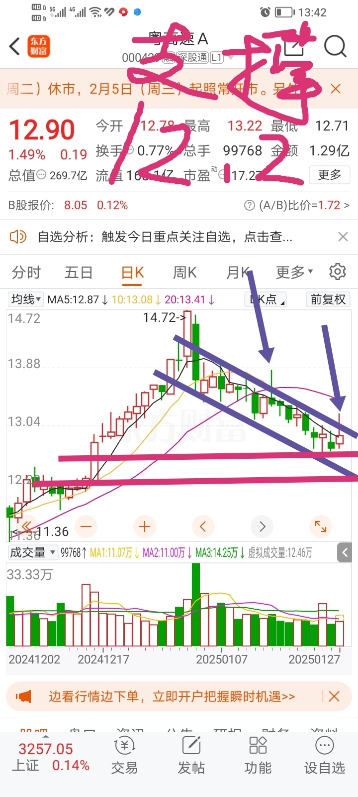 $粤高速A(SZ000429)$ 技术支撑,12.2元。还有下跌空间,今天的冲高就是9诱多,再次卖高价筹码。