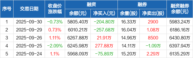 粤高速A:融资净偿还204.8万元,融资余额5805.4万元(09-30)