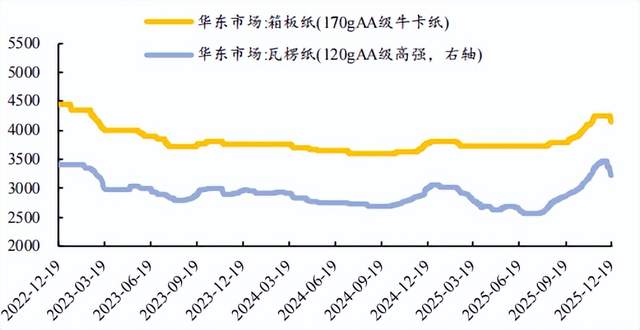 转机出现在2025年。随着行业去库存接近尾声,叠加企业联合限产保价,纸价从2025年二季度开始逐步回升。截至11月底,全国瓦楞纸市场价回升至3250元/吨,较年初上涨16.9%;白卡纸价格升至4800元/吨,同比上涨14.3%;文化纸中的双胶纸价格达到5600元/吨,环比上涨8.7%。