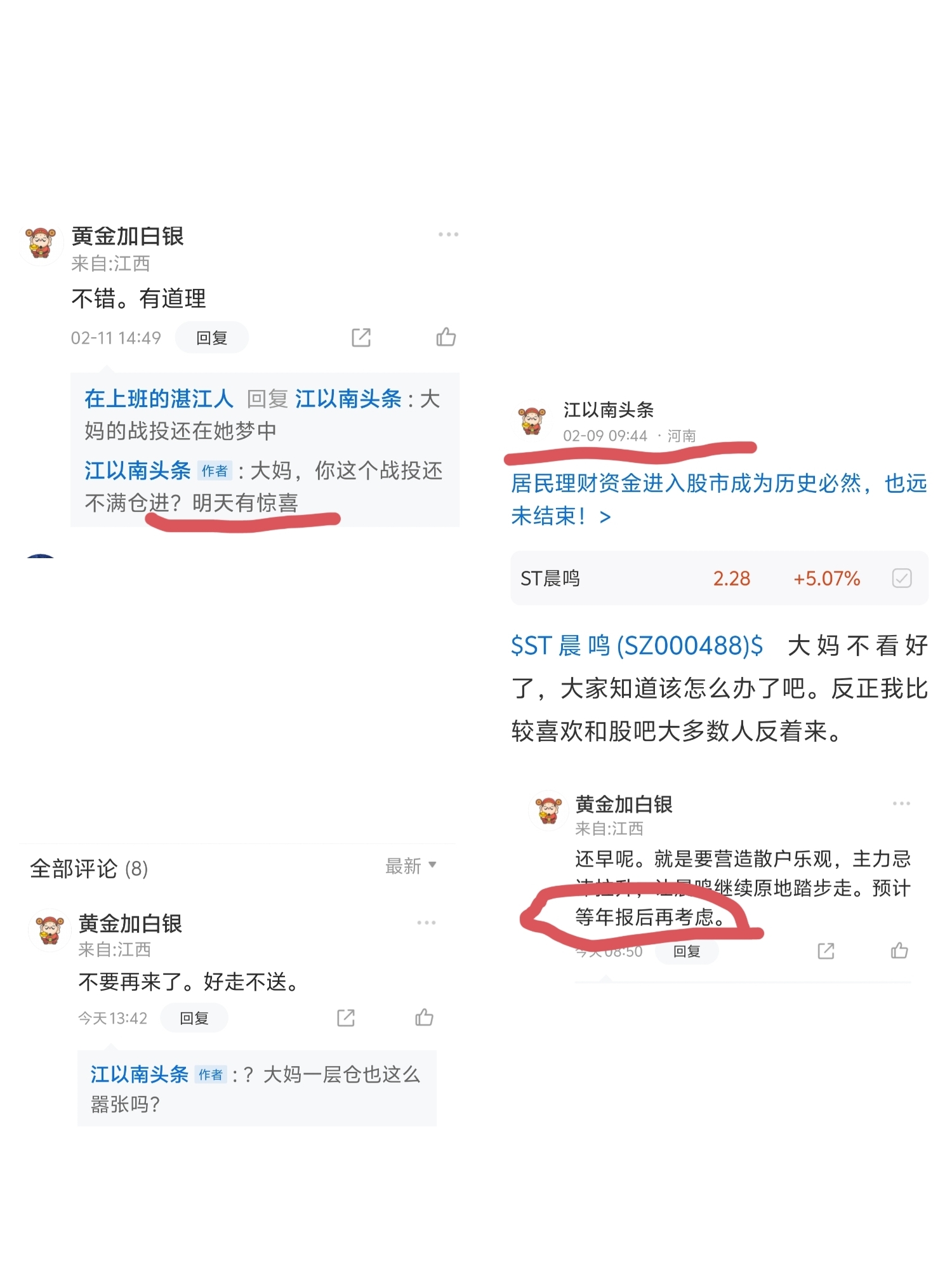 $ST晨鸣(SZ000488)$ 大妈一层仓说话也这么硬气吗?还叫我不要再来了。别说这几天大妈不出来发帖,行情走的老好了。