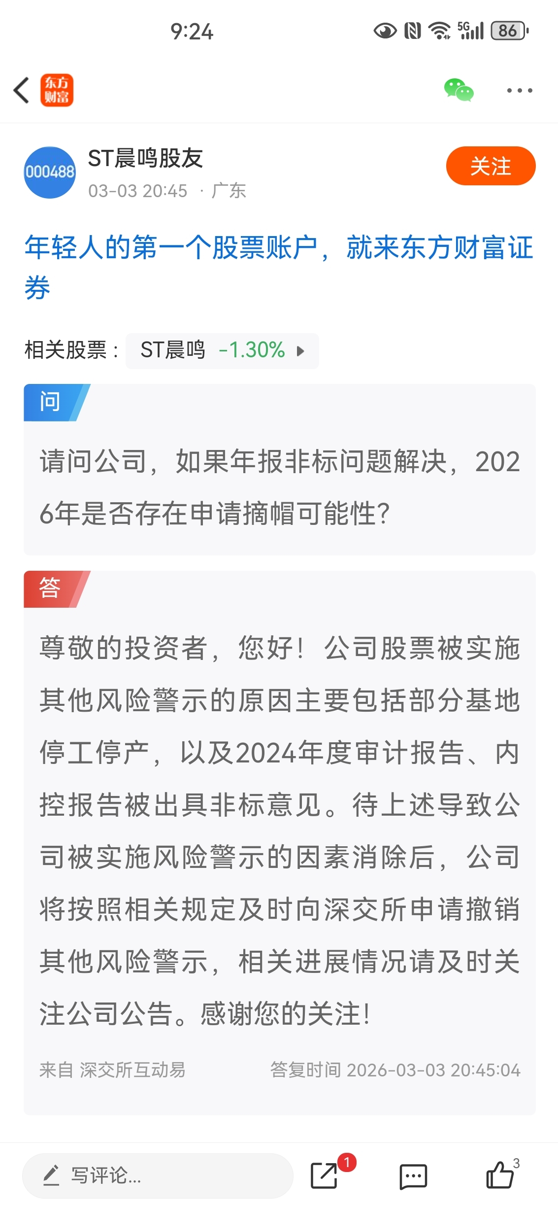 $ST晨鸣(SZ000488)$ 公司今天回答提问再次验证,摘帽条件不需要最近一个年度盈利为正。