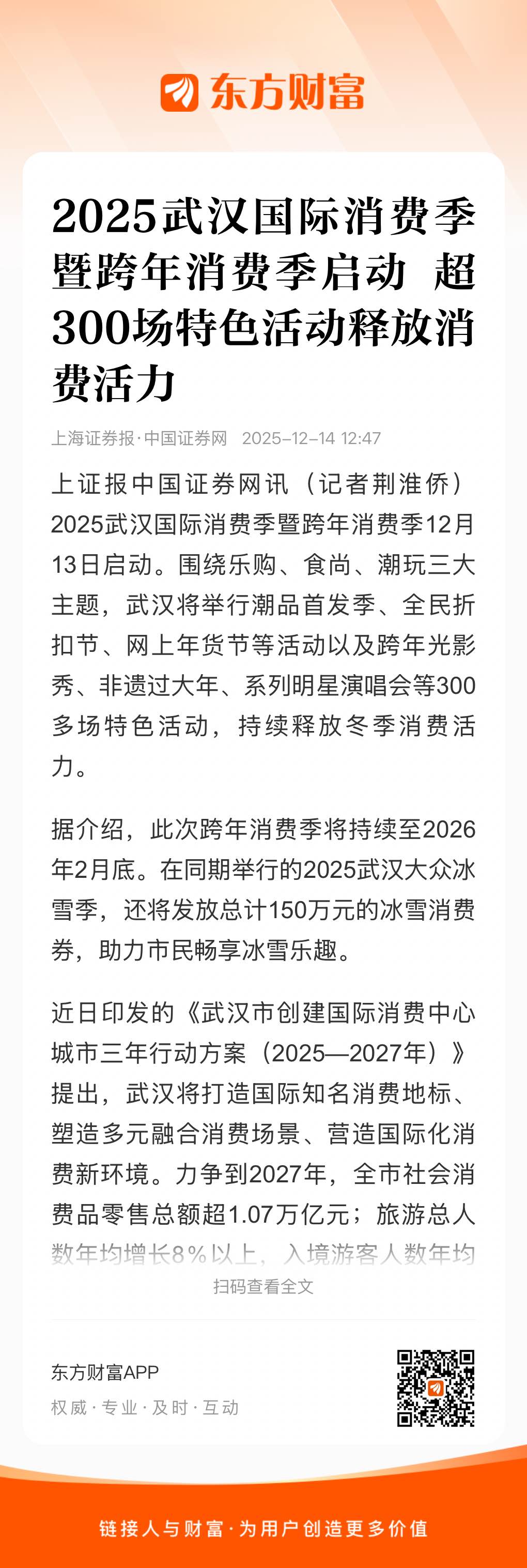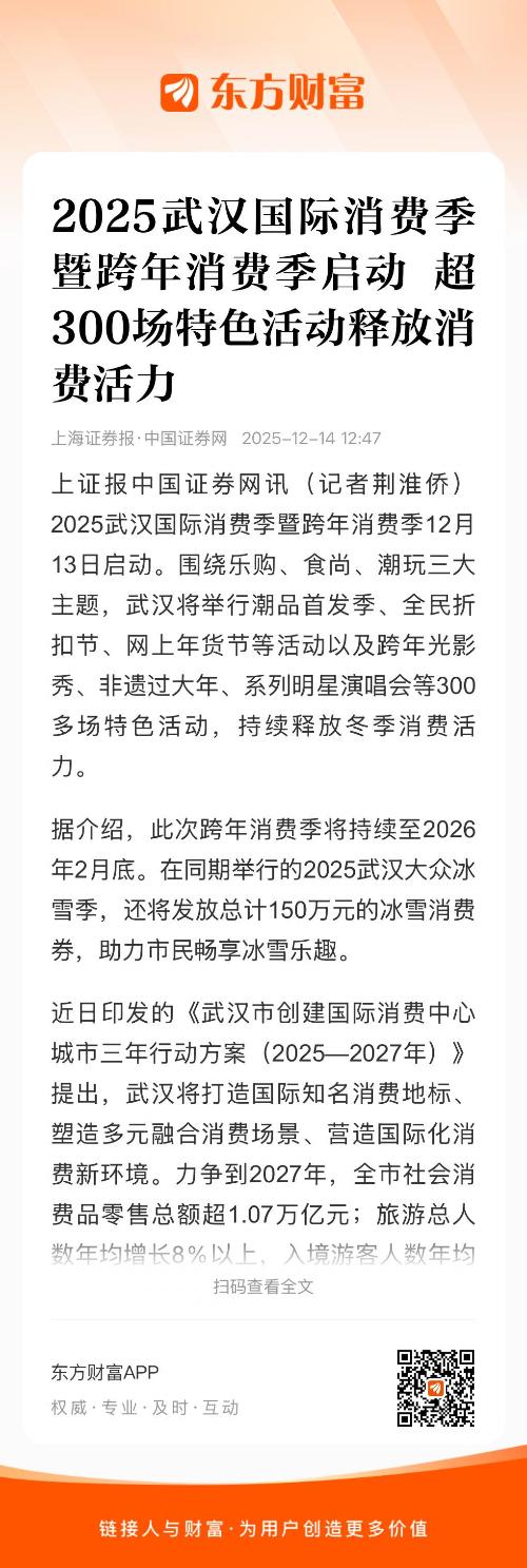 上证报中国证券网讯(记者荆淮侨)2025武汉国际消费季暨跨年消费季12月13日启动。围绕乐购、食尚、潮玩三大主题,武汉将举行潮品首发季、全民折扣节、网上年货节等活动以及跨年光影秀、非遗过大年、系列明星演唱会等300多场特色活动,持续释放冬季消费活力。