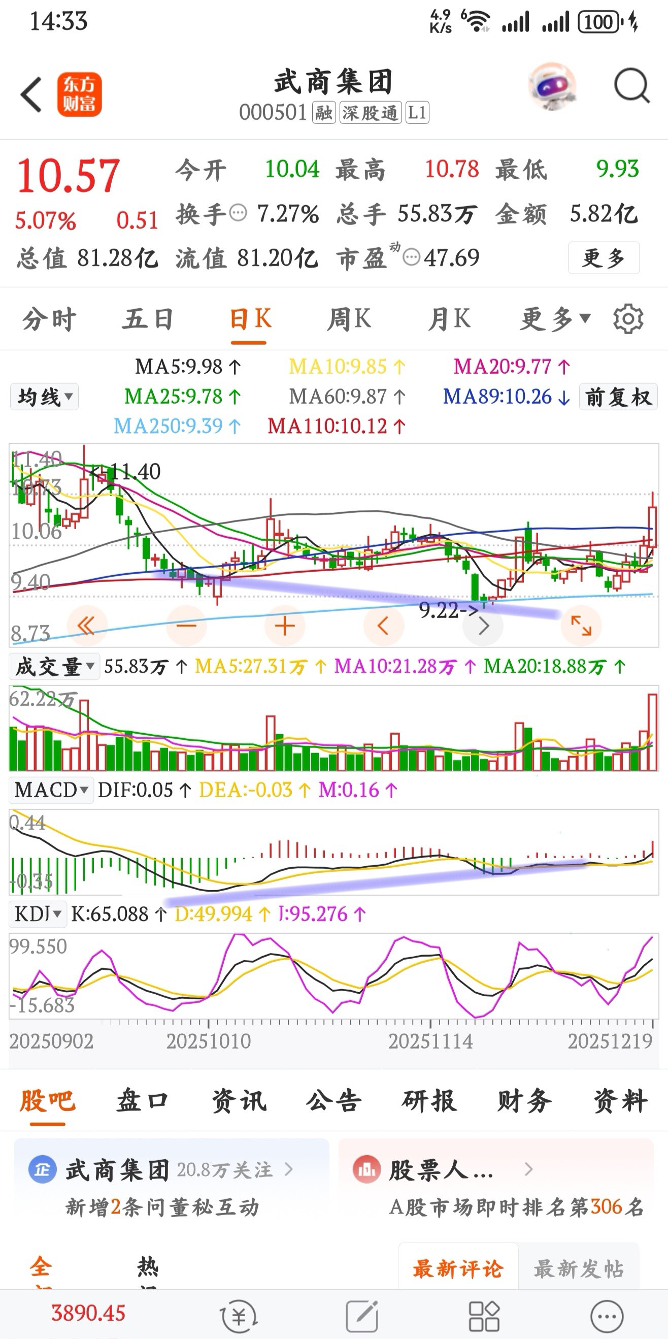 $武商集团(SZ000501)$ 武商集团于11月27日形成日K线底背离离结构,11月28日大阳线突破趋势,然后展开洗盘再次回踩到年线附近,12月19日再次放量大阳线突破近期前高点和趋势,大概率启动新的一个上涨波段空间。个人观点,不喜勿喷!也不构成投资依据!