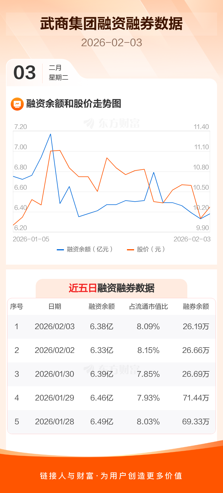 交易所最新数据显示,武商集团于2026年2月3日获融资买入2072.04万元,融资偿还1537.07万元,当日融资净买入534.97万元。目前,该股融资余额6.38亿,占流通市值比例为8.09%。