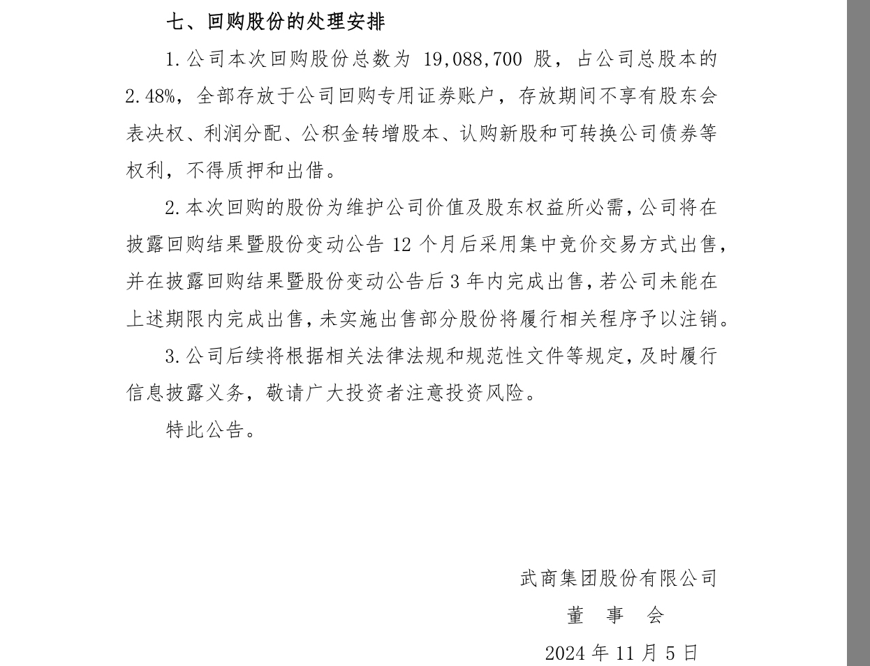 2024年11月5号回购1908.87万股(之前有公告)