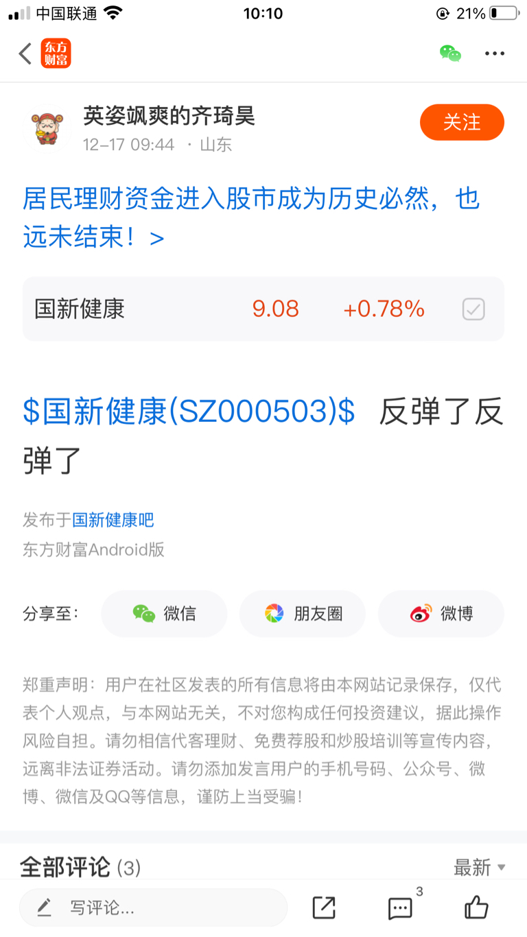 $国新健康(SZ000503)$ 山东帮发帖时间9:44,此时股价9.22元,就是今天最高点,然后就A杀,此时股价9.08元,有些事你不得不信。