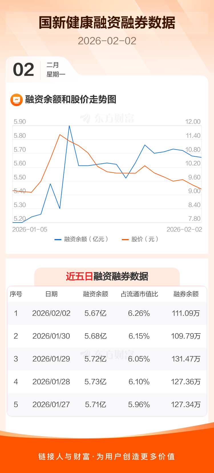交易所最新数据显示,国新健康于2026年2月2日获融资买入809.50万元,融资偿还934.81万元,当日融资净偿还125.31万元。目前,该股融资余额5.67亿,占流通市值比例为6.26%。