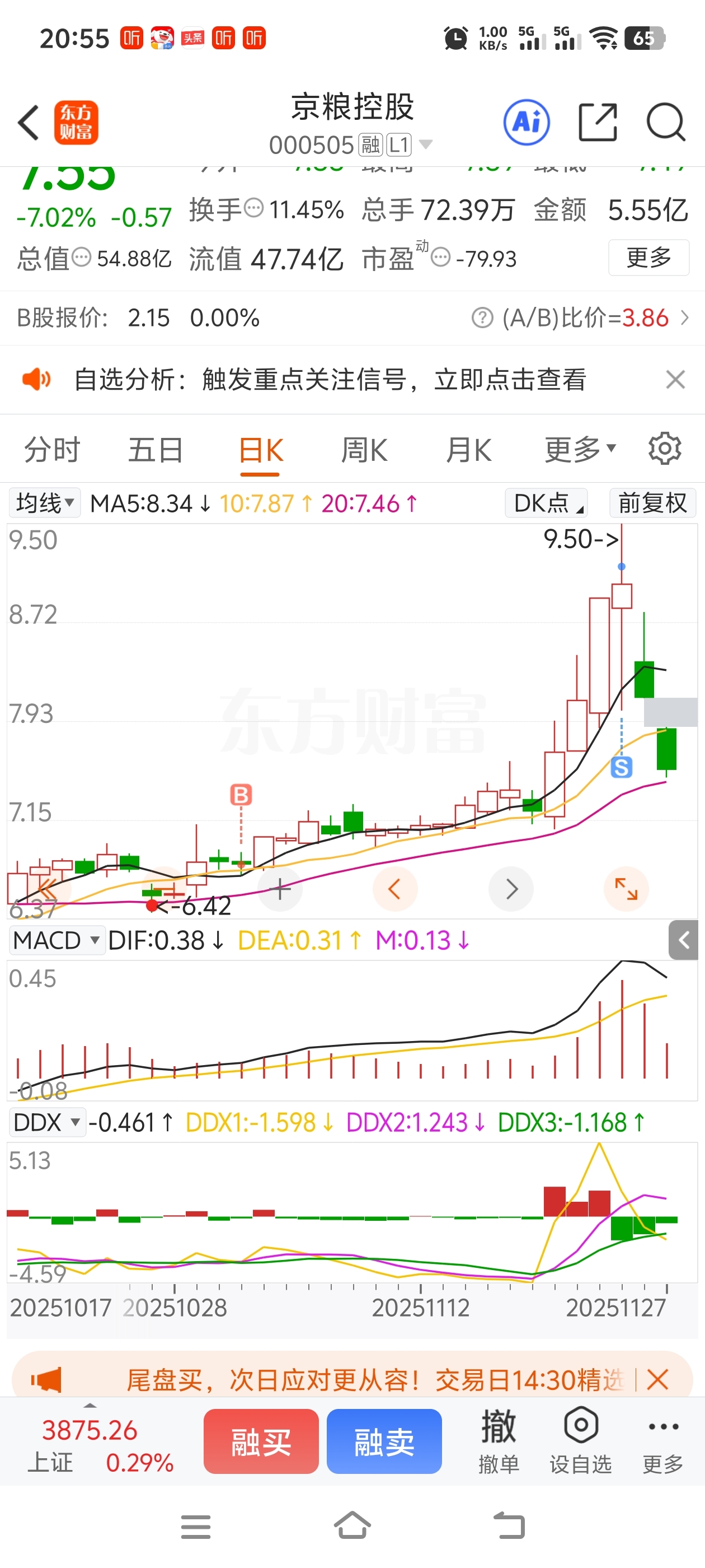 $京粮控股(SZ000505)$ 那天没有地天,然后下午冲高没封板我就跑了