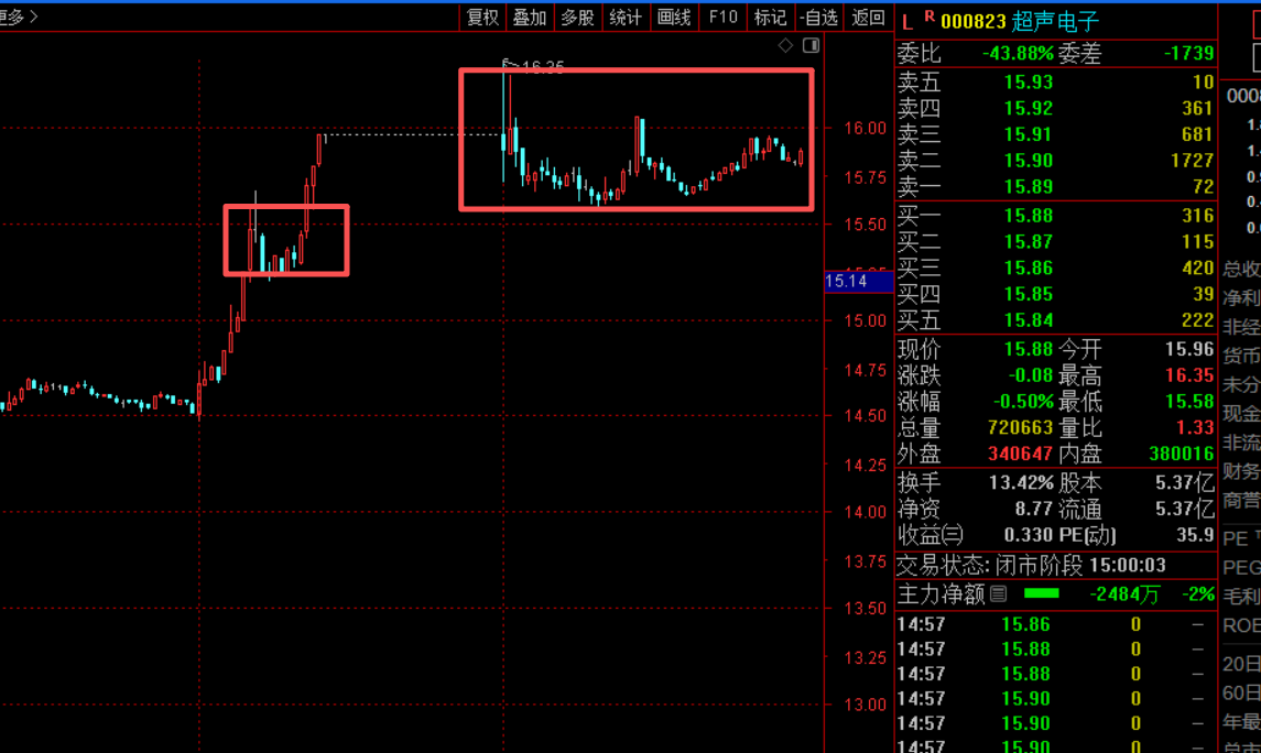 超声今天从缠论的走势结构拆解看,真是挺标准的,也是符合缠论结构里面三M的位置,今天高位震荡,五分钟的小级别走势,正好是回踩前期突破的中枢结构上沿,然后在上沿的位置震荡,日线大级别趋势运行的方向向上的格局没有任何的改变,今天分时震荡整理,小级别的走势构筑上升中枢,明天走势就要向上加速走强了。