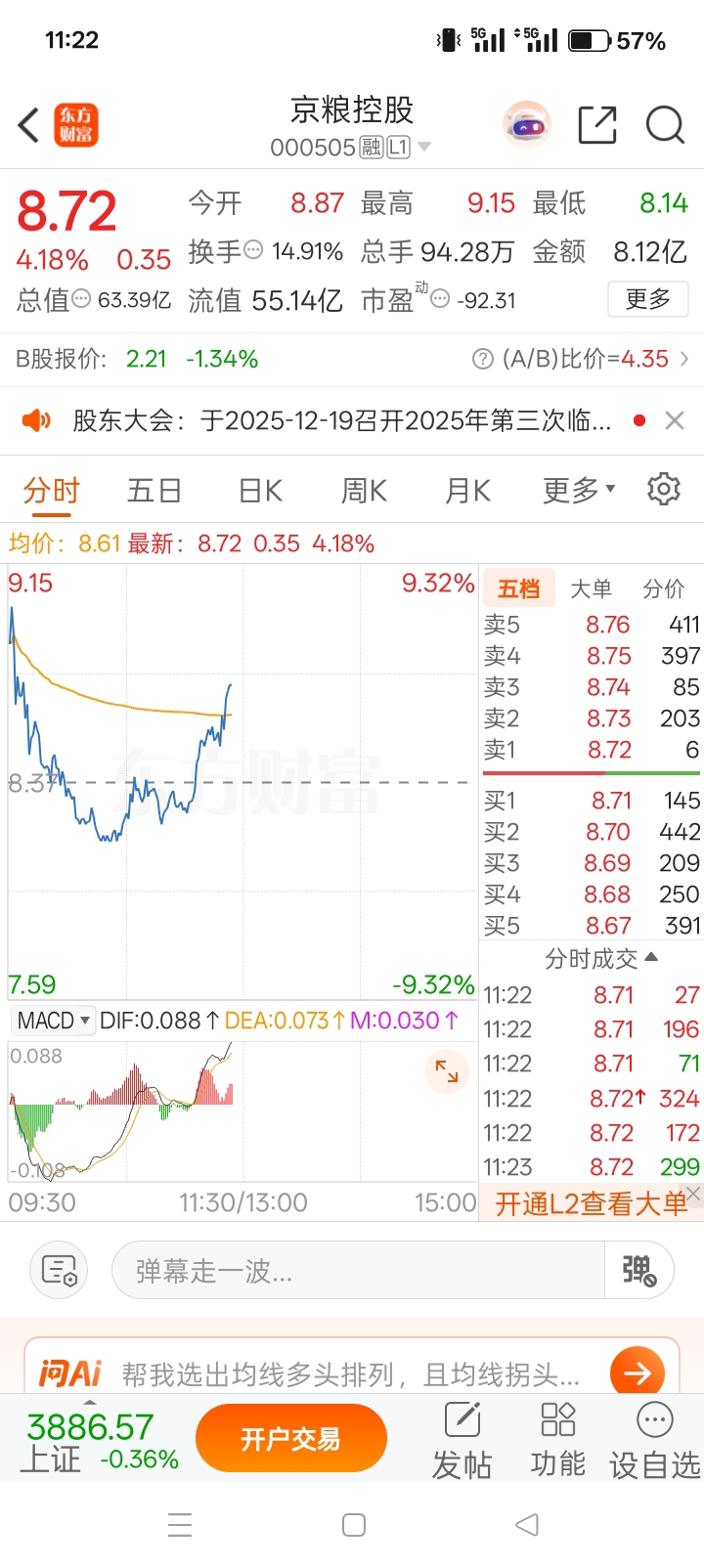 $京粮控股(SZ000505)$ 继续上车,强者恒强,兄弟们,吃肉起飞