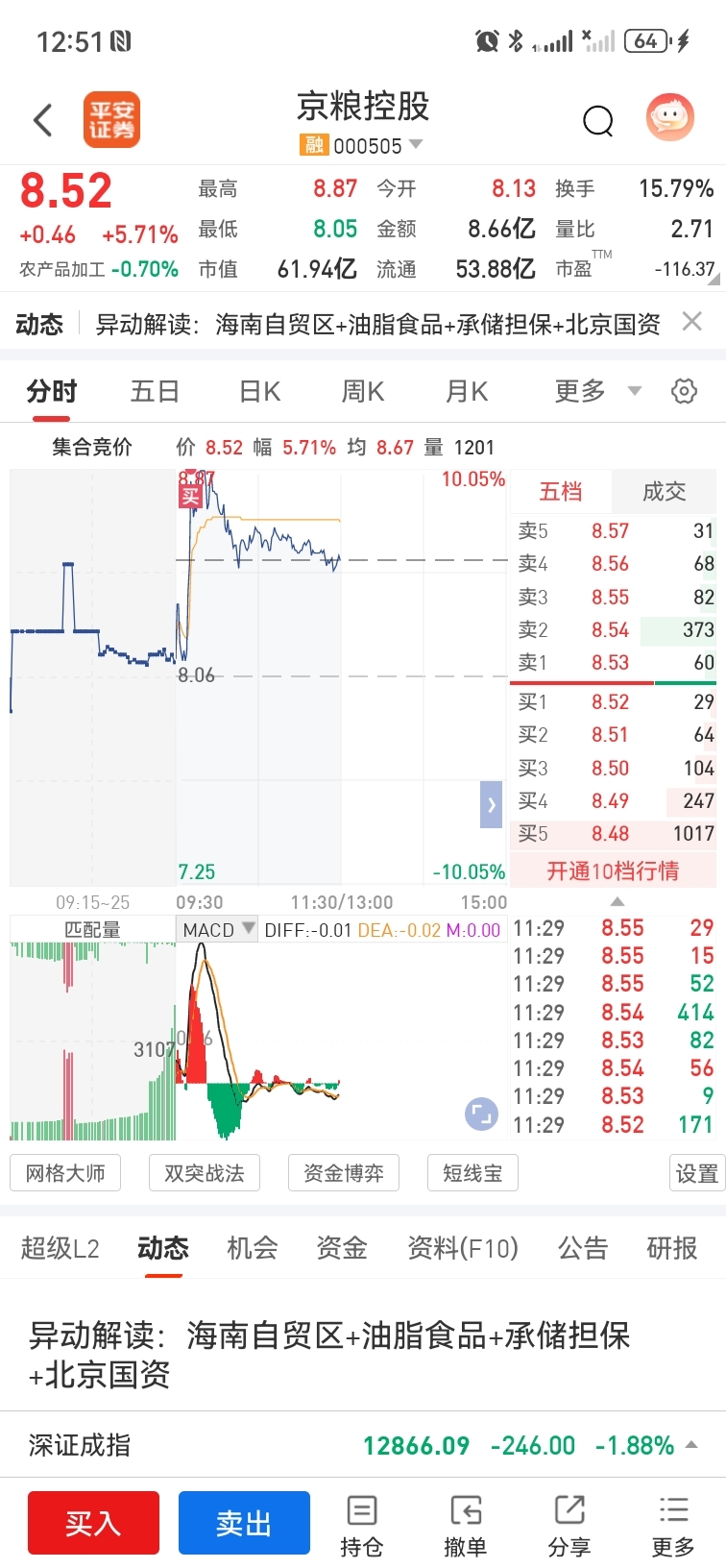 $京粮控股(SZ000505)$ 吃了个大面,真是冲动了
