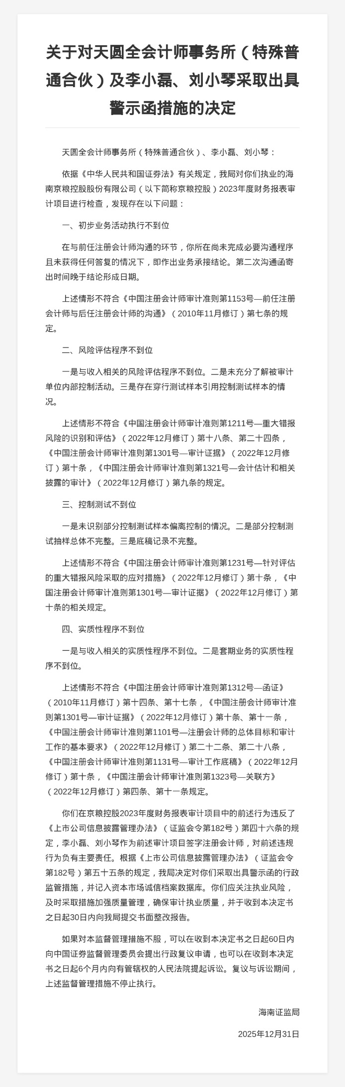 针对以上问题,海南证监局决定对天圆全会计师事务所(特殊普通合伙)、李小磊、刘小琴采取出具警示函的行政监管措施,并记入资本市场诚信档案数据库。