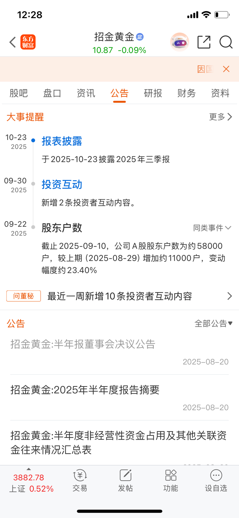 $招金黄金(SZ000506)$ 三季度报表提前23号公布了