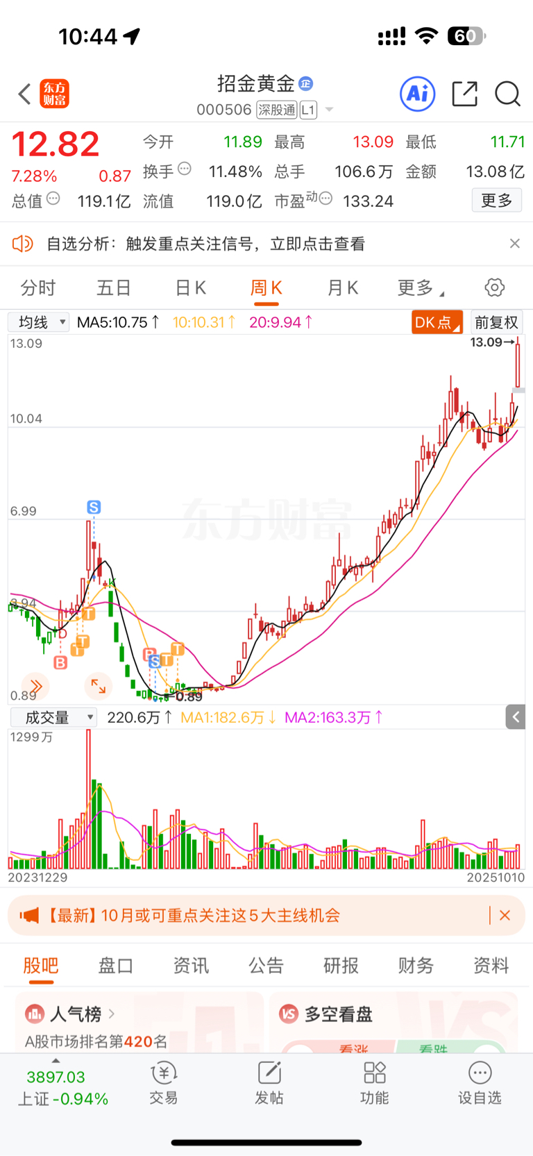 $招金黄金(SZ000506)$ 1块钱抄的底,之前26个跌停板谁知道啊?没拿住,错过1年13倍的发财机会