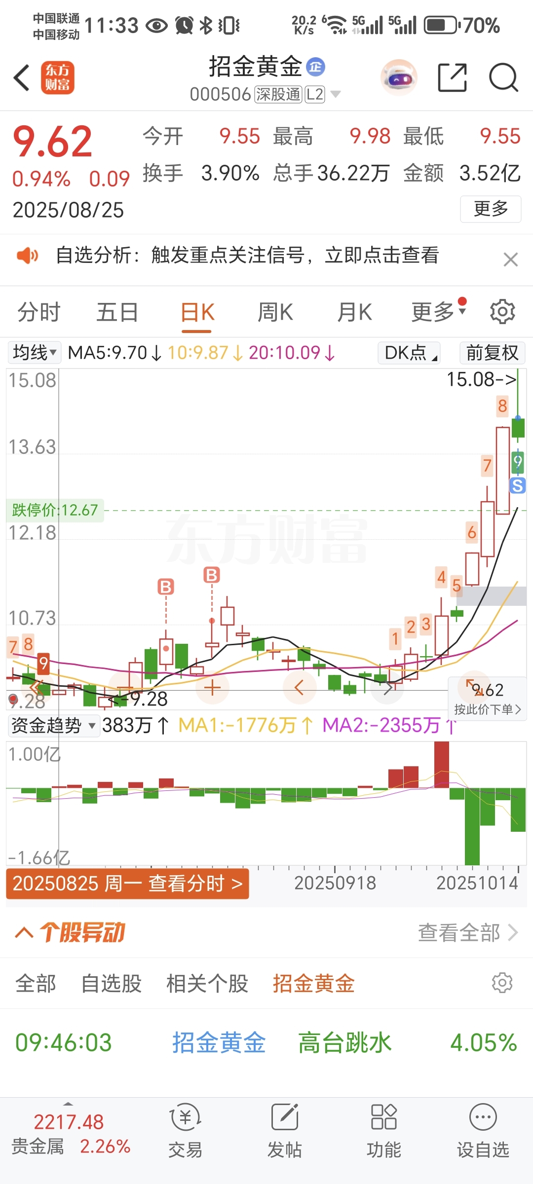 $招金黄金(SZ000506)$ 割了。还会涨,但应该要调整了。这个股让我感觉涨的没有上限但还是先保留利润吧,