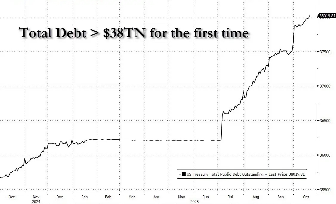 美国联邦政府债务突破38万亿,什么时候突破40万亿呢?让黄金涨到5000美元一盎
