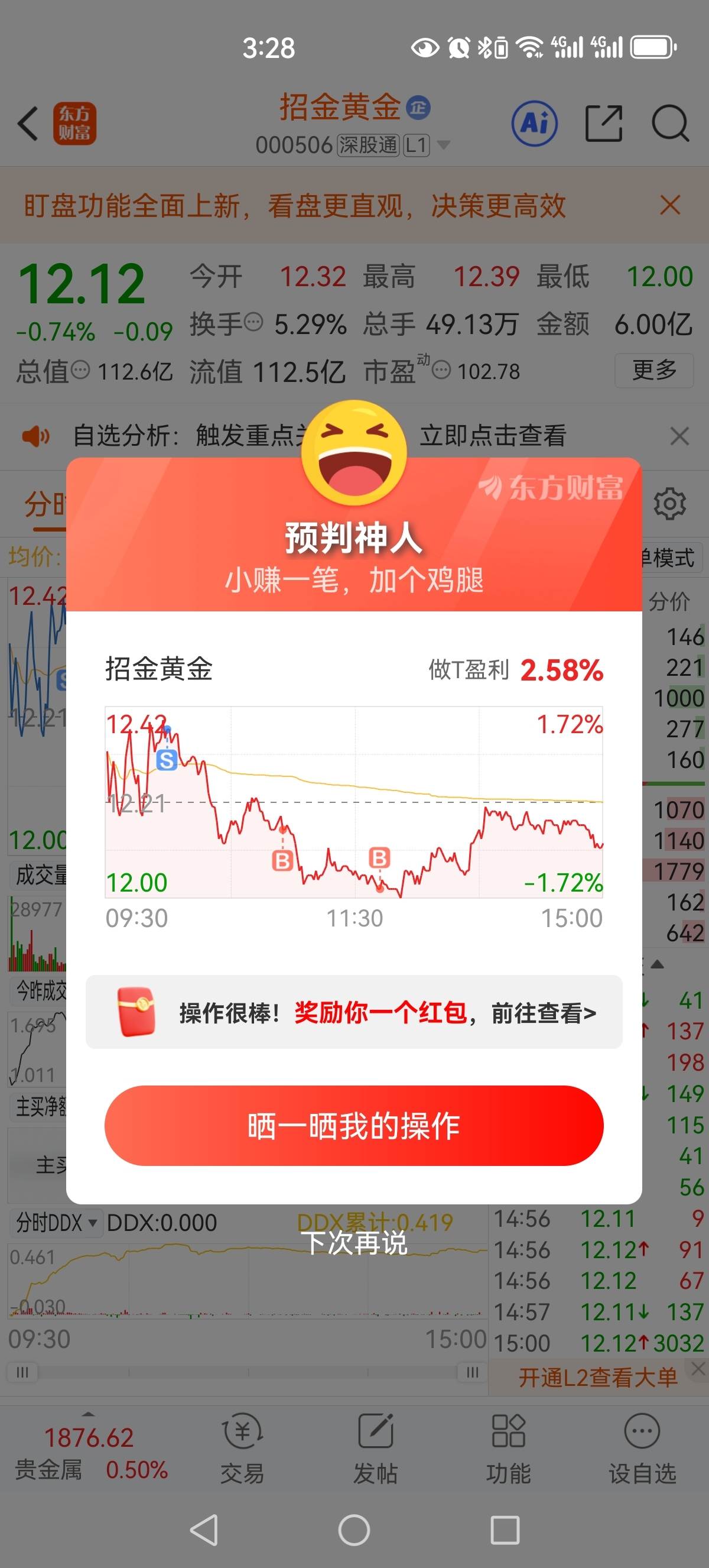 $招金黄金(SZ000506)$ 今天没忍住又加了一些,周一看好你,带我们吃面