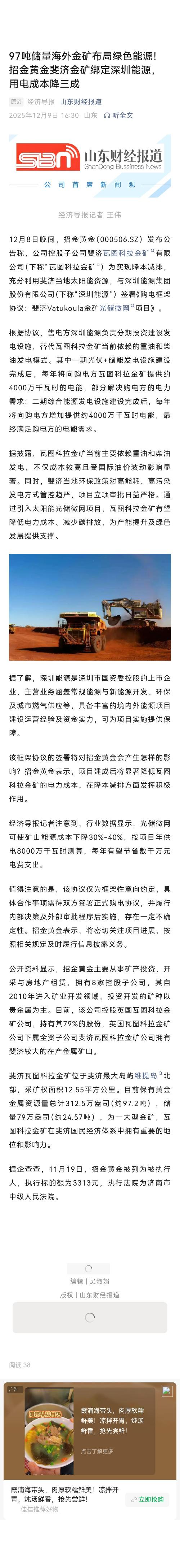 97吨储量海外金矿布局绿色能源!招金黄金斐济金矿绑定深圳能源,用电成本降三成 原创 经济导报 山东财经报道 2025年12月9日 16:30 山东 听全文 经济导报记者 王伟12月8日晚间,招金黄金(000506.SZ)发布公告称,公司控股子公司斐济瓦图科拉金矿有限公司(下称“瓦图科拉金矿”)为实现降本减排,充分利用斐济当地太阳能资源,与深圳能源集团股份有限公司(下称“深圳能源”)签署《购电框架协议:斐济Vatukoula金矿光储微网项目》。根据协议,售电方深圳能源负责分期投资建设发电设施,替代瓦图科拉金矿当前依赖的重油和柴油发电模式。其中一期光伏+储能发电设施建设完成后,每年将向购电方瓦图科拉金矿提供约4000万千瓦时的电能,部分解决购电方的电力需求;二期综合能源发电设施建设完成后,每年将向购电方增加提供约4000万千瓦时电能,最终满足购电方的电能需求。据披露,瓦图科拉金矿当前主要依赖重油和柴油发电,不仅成本较高且受国际油价波动影响显著。同时,斐济当地环保政策对高能耗、高污染发电方式管控趋严,项目立项审批日益严格。通过引入太阳能光储微网项目,瓦图科拉金矿有望降低电力成本、减少碳排放,为产能提升及绿色发展提供支撑。据了解,深圳能源是深圳市国资委控股的上市企业,主营业务涵盖常规能源与新能源开发、环保及城市燃气供应等,具备丰富的境内外能源项目建设运营经验及资金实力,可为项目实施提供保障。该框架协议的签署将对招金黄金会产生怎样的影响?招金黄金表示,项目建成后将显著降低瓦图科拉金矿的电力成本,在降本减排方面发挥积极作用。经济导报记者注意到,行业数据显示,光储微网可使矿山能源成本下降30%-40%,按项目年供电8000万千瓦时测算,每年有望节省数千万元电费支出。值得注意的是,该协议仅为框架性意向约定,具体合作事项需待双方签署正式购电协议,并履行内部决策及外部审批程序后实施,存在一定不确定性。招金黄金表示,将密切关注项目进展,按照相关规定及时履行信息披露义务。公开资料显示,招金黄金主要从事矿产投资、开采与房地产租赁,拥有8家控股子公司,其自2010年进入矿业开发领域,投资开发的矿种以贵金属为主。目前,该公司控股英国瓦图科拉金矿公司,持有其79%的股份,英国瓦图科拉金矿公司下属全资子公司斐济瓦图科拉金矿公司拥有斐济较大的在产金属矿 //@柔和的雷古力娜扎 :招金黄金:斐济子公司与深圳能源签光储微网购电框架协议中国证券报中证网中证智能财讯招金黄金(000506)12月9日公告,公司控股子公司斐济瓦图科拉金矿有限公司为降本减排,与深圳能源集团股份有限公司签署了《购电框架协议》。根据协议,瓦图科拉金矿将从深圳能源投资建设的斐济光储微网项目购买光伏电能,基准销售电价为0.17美元/千瓦时。瓦图科拉金矿当前采用成本较高且受油价波动影响的重油和柴油发电。此举旨在...