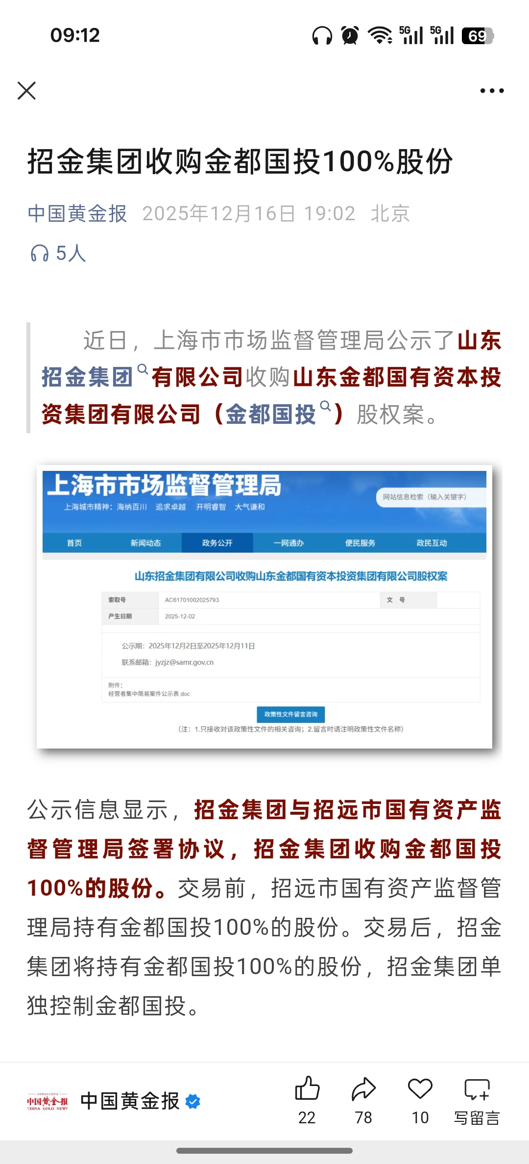 $招金黄金(SZ000506)$ 这算是利好吗?