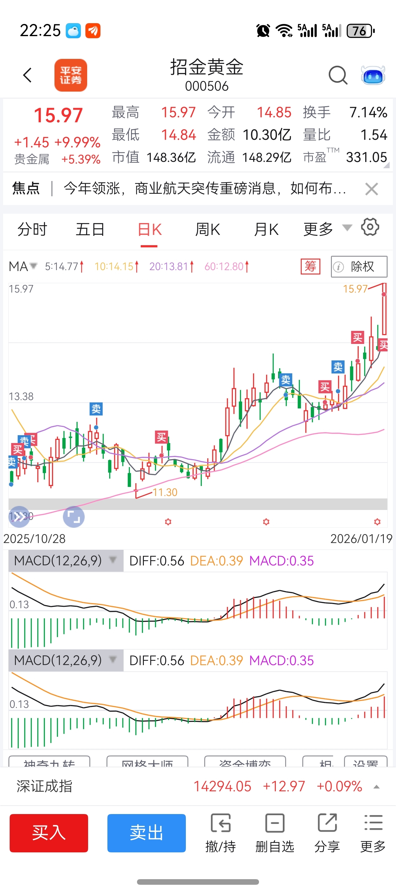 $招金黄金(SZ000506)$ #炒股日记# 去年5月20号进来,一直都拿着,中途有买有卖,今天突破前高,继续看多
