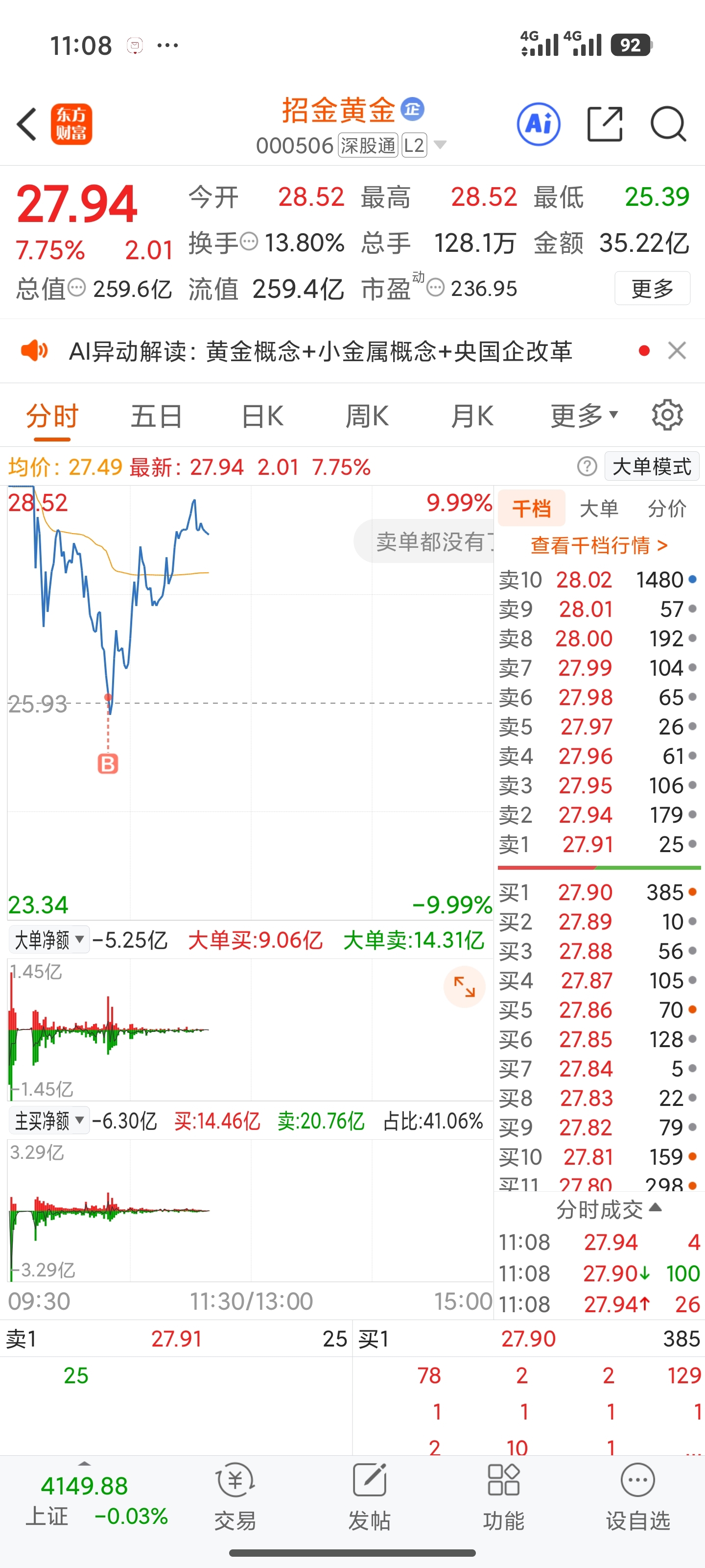 $招金黄金(SZ000506)$ 昨天本来寻思做个t,结果下午一直不开板,早上挂单成了是我没想到的