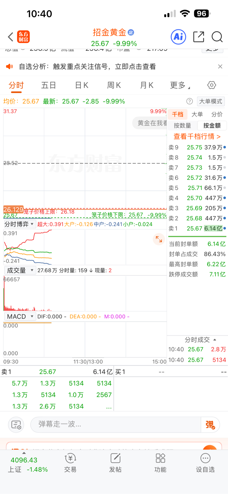 $招金黄金(SZ000506)$ 韭菜真没吃过亏……还挂单割肉跑,这些压单一部分是主力制造恐慌,绝大部分都是小散挂单割肉! 暗盘没看,明盘跌停成交七个多亿,包括板块资金都是净流入!湖南黄金都没倒,割肉干嘛,最多就是拿着不动,周一再跌就加仓,参考航天之前的跌停,最后都涨回来,国际形势不变,黄金就是硬通货