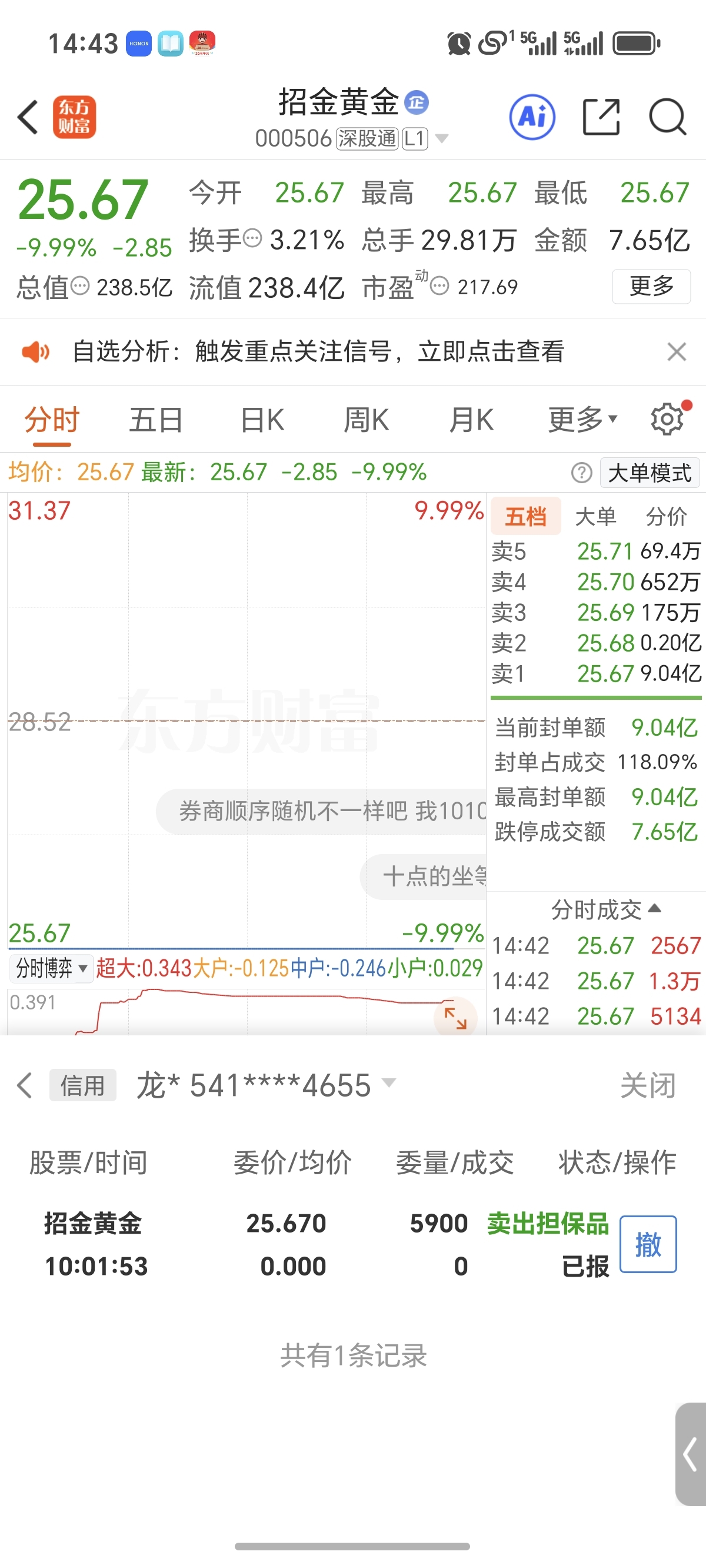 $招金黄金(SZ000506)$ 能不能排到我,昨天涨停价进的