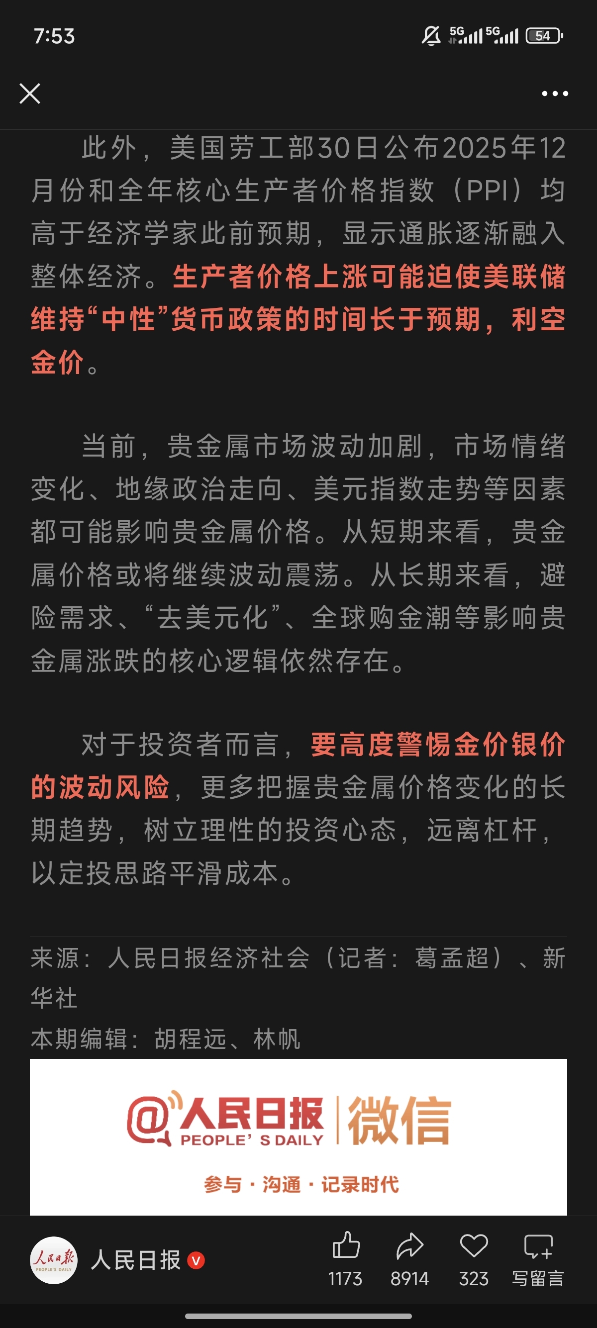 $招金黄金(SZ000506)$ 人民日报刚刚发的,黄金的核心逻辑依旧存在!央妈都建议定投,长期总会涨上去,航空航天硬炒作起来的,也涨上去了,更何况是黄金!黄金股割肉是最蠢的,无非是时间换空间罢了。周一再跌停就没必要走了,不要恐慌!半年后再来看!
