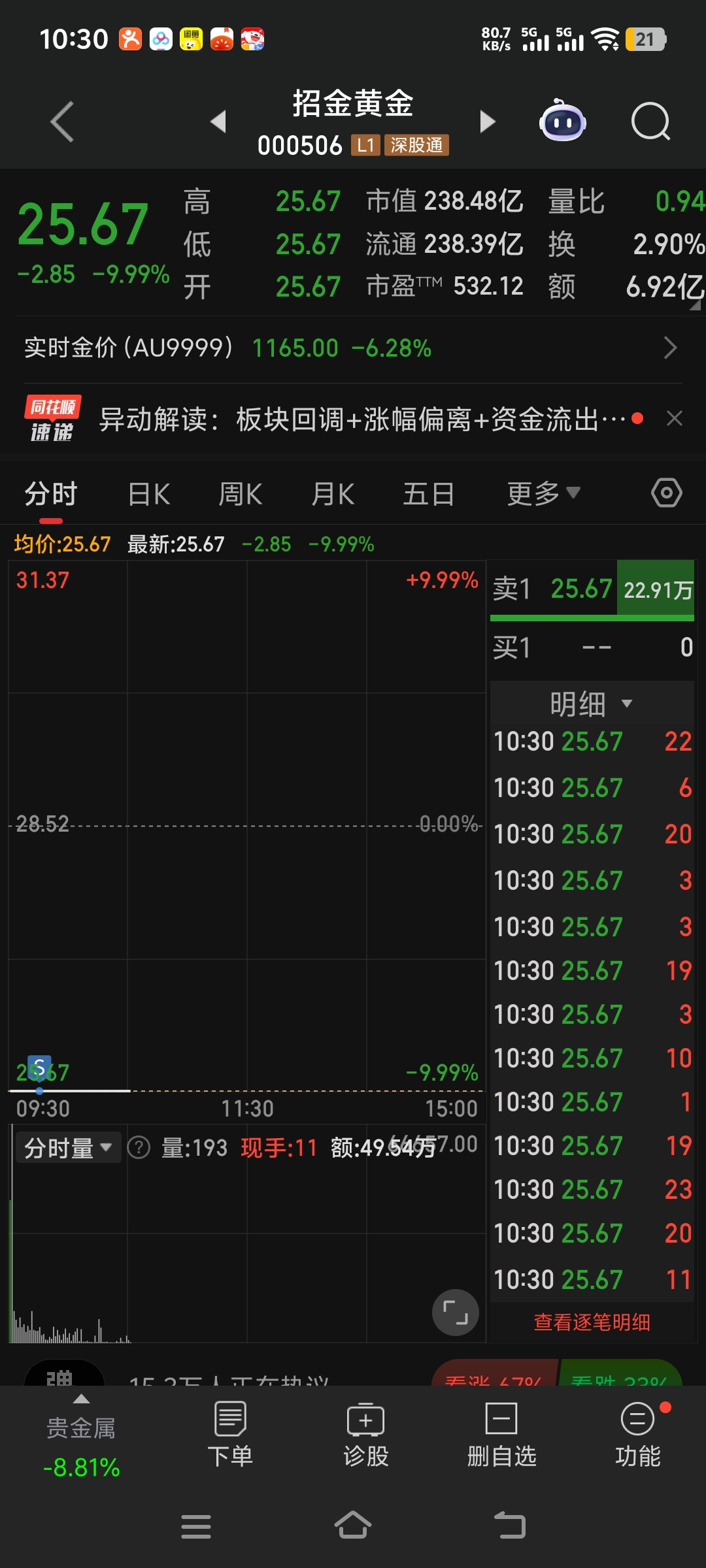 $招金黄金(SZ000506)$ 上周五说了跑,非得贪?
