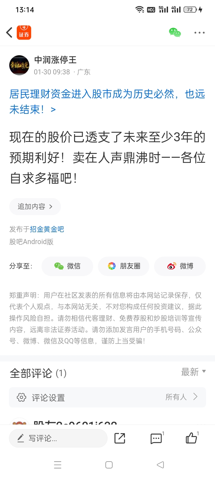 温馨提示: 1.根据《证券法》规定,禁止编造、传播虚假信息或者误导性信息,扰乱证券市场;2.用户在本社区发表的所有资料、言论等仅代表个人观点,与本网站立场无关,不对您构成任何投资建议。用户应基于自己的独立判断,自行决定证券投资并承担相应风险。《东方财富社区管理规定》