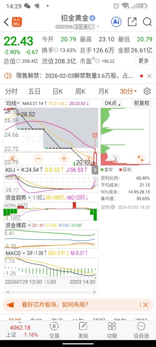 $招金黄金(SZ000506)$  哈哈地天板。感谢神。
