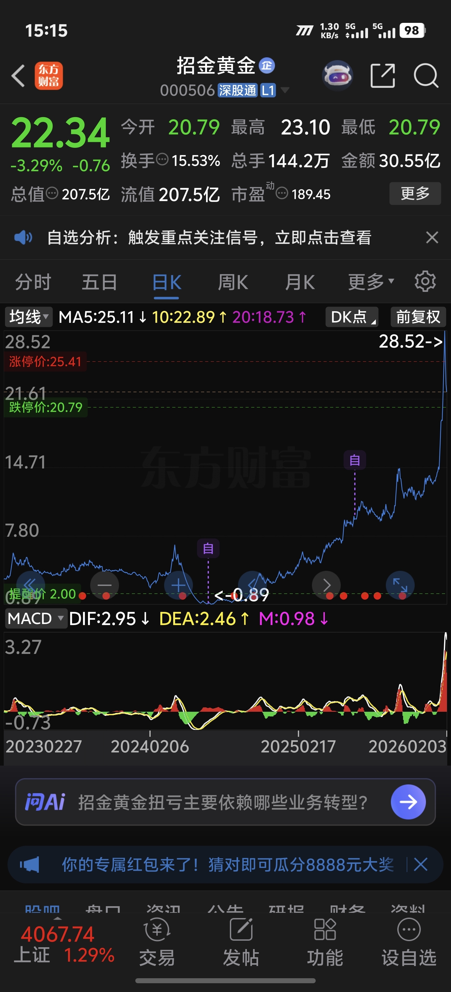 $招金黄金(SZ000506)$ 天生没有发财的命。这个研究三个月终于等连续暴跌1快买十万准备锁仓。十倍出本后续博连续暴涨放巨量清。结果第二天就出了。