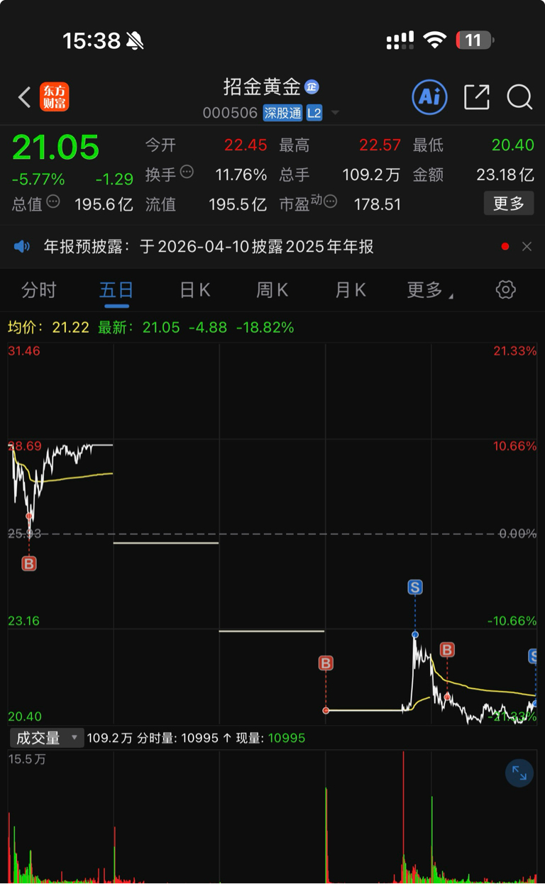$招金黄金(SZ000506)$ 今天 T 了个空气,明天重新来!