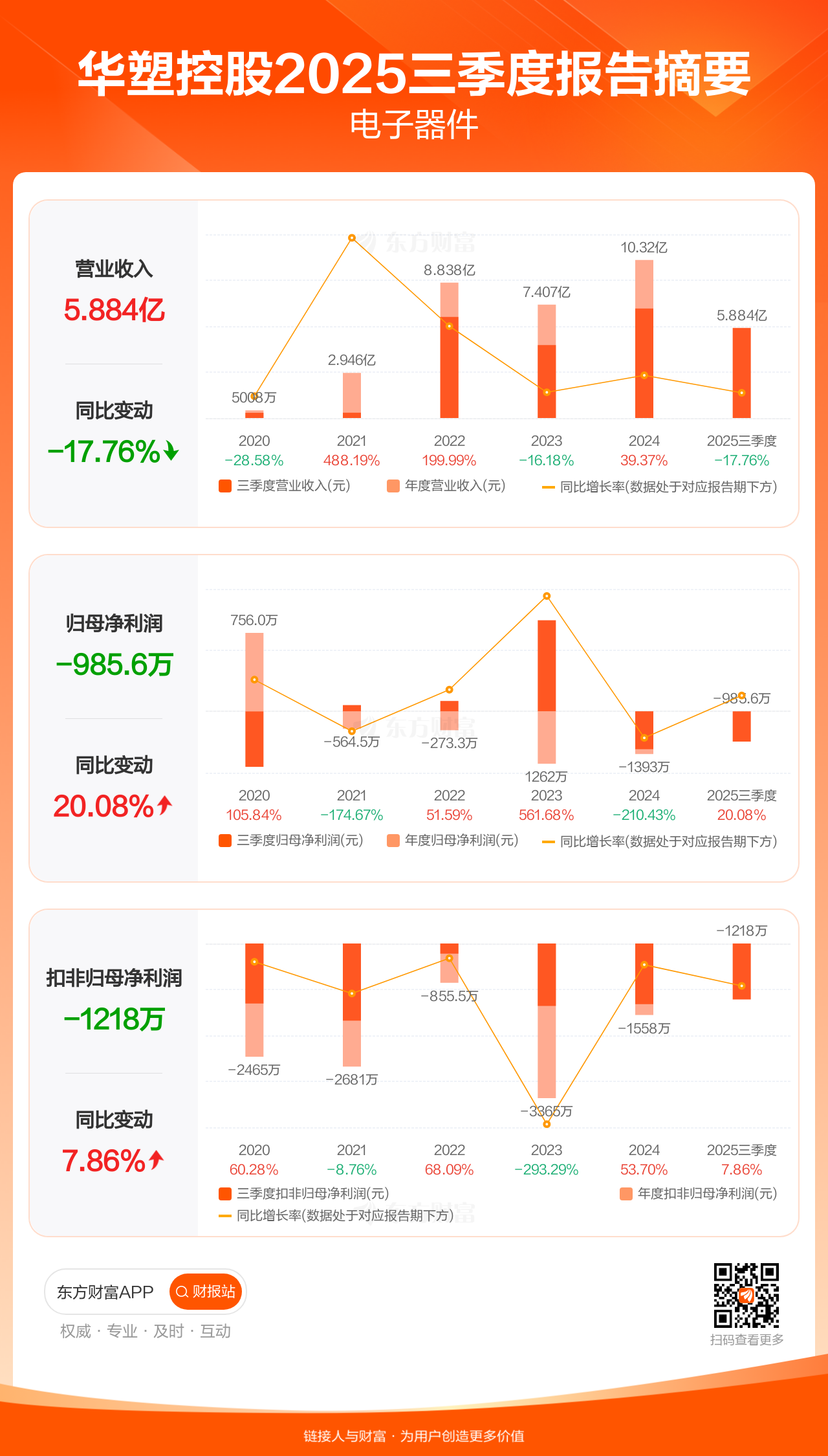 华塑控股10月31日发布2025年三季报显示,公司前三季实现营业收入5.88亿元,同比下滑17.76%;归母净利润-985.59万元;扣非归母净利润-1218.02万元。