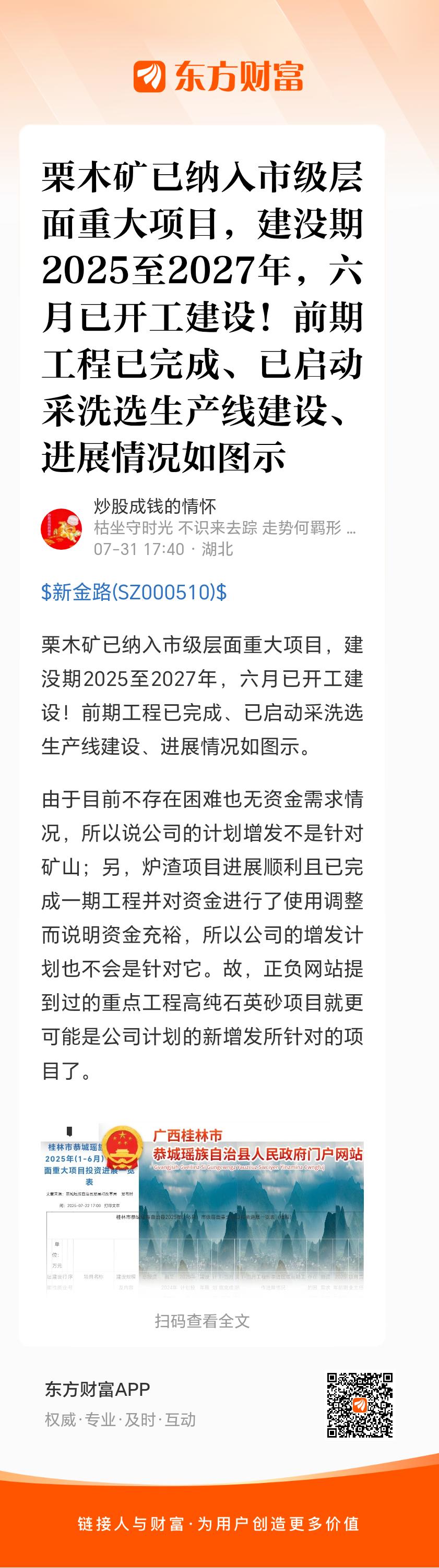 由于目前不存在困难也无资金需求情况,所以说公司的计划增发不是针对矿山;另,炉渣项目进展顺利且已完成一期工程并对资金进行了使用调整而说明资金充裕,所以公司的增发计划也不会是针对它。故,正负网站提到过的重点工程高纯石英砂项目就更可能是公司计划的新增发所针对的项目了。