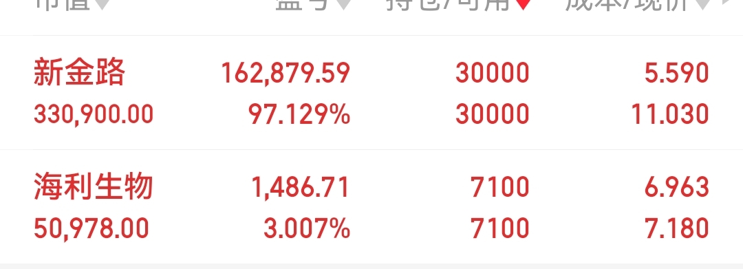 $新金路(SZ000510)$ 今天大盘走势这样弱,手里竟然一个涨停一个红,真是骑妖牵牛