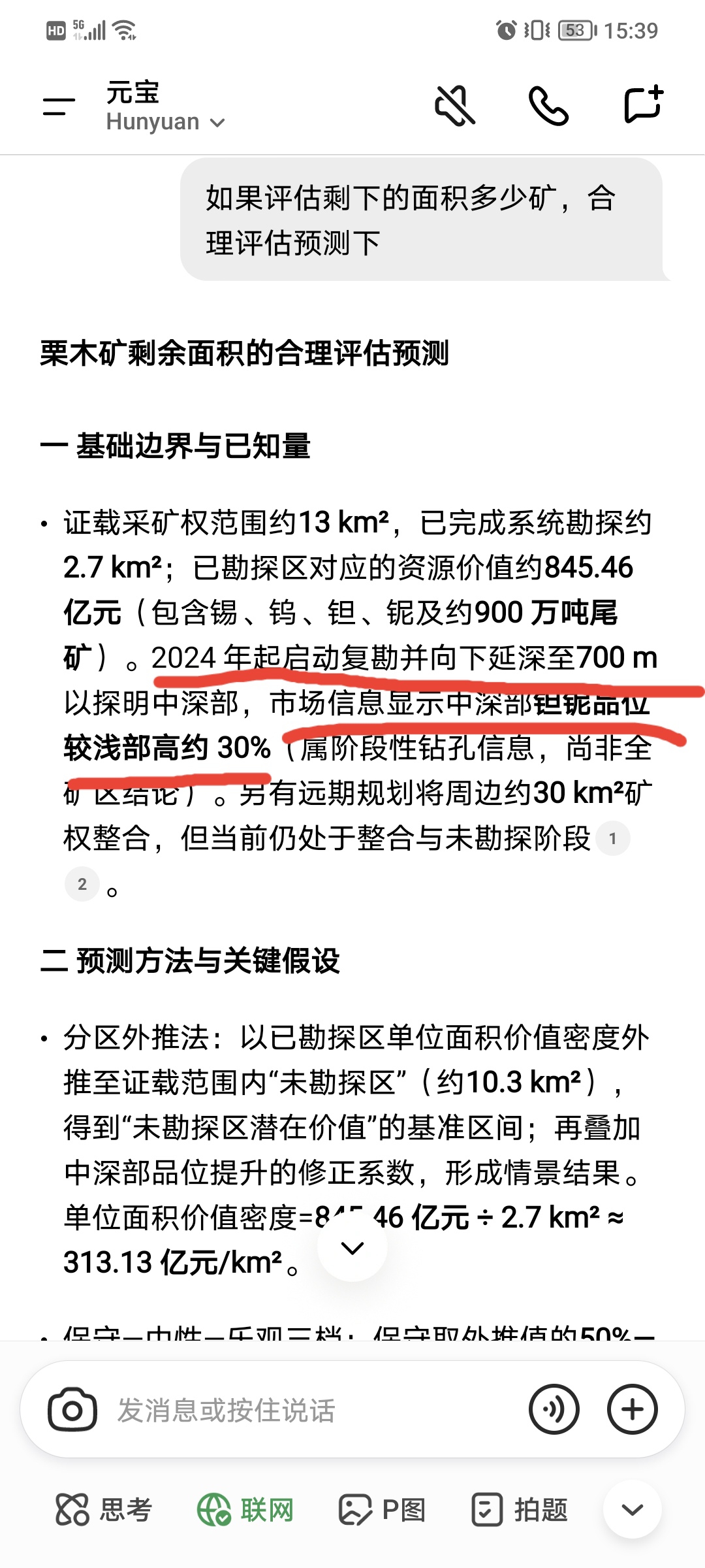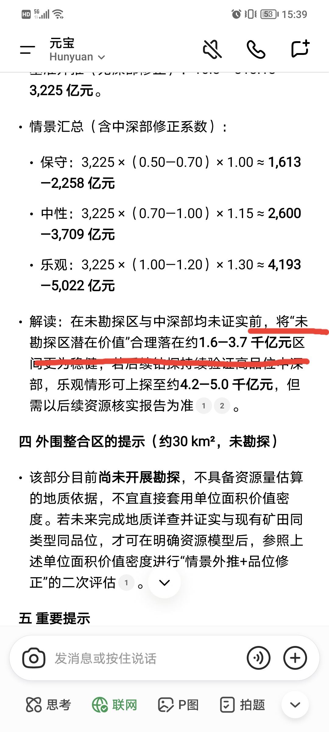 $新金路(SZ000510)$ 已经探明的2.7平方公里的矿产资源价值在900亿,去年复探时还要高百分之三十,看看元宝对未探明的9公里的预测,另外30公里未勘探在整合,没有统计,人工智能给这13平方公里的证采面积的资源给予了最低2500亿储量的估值