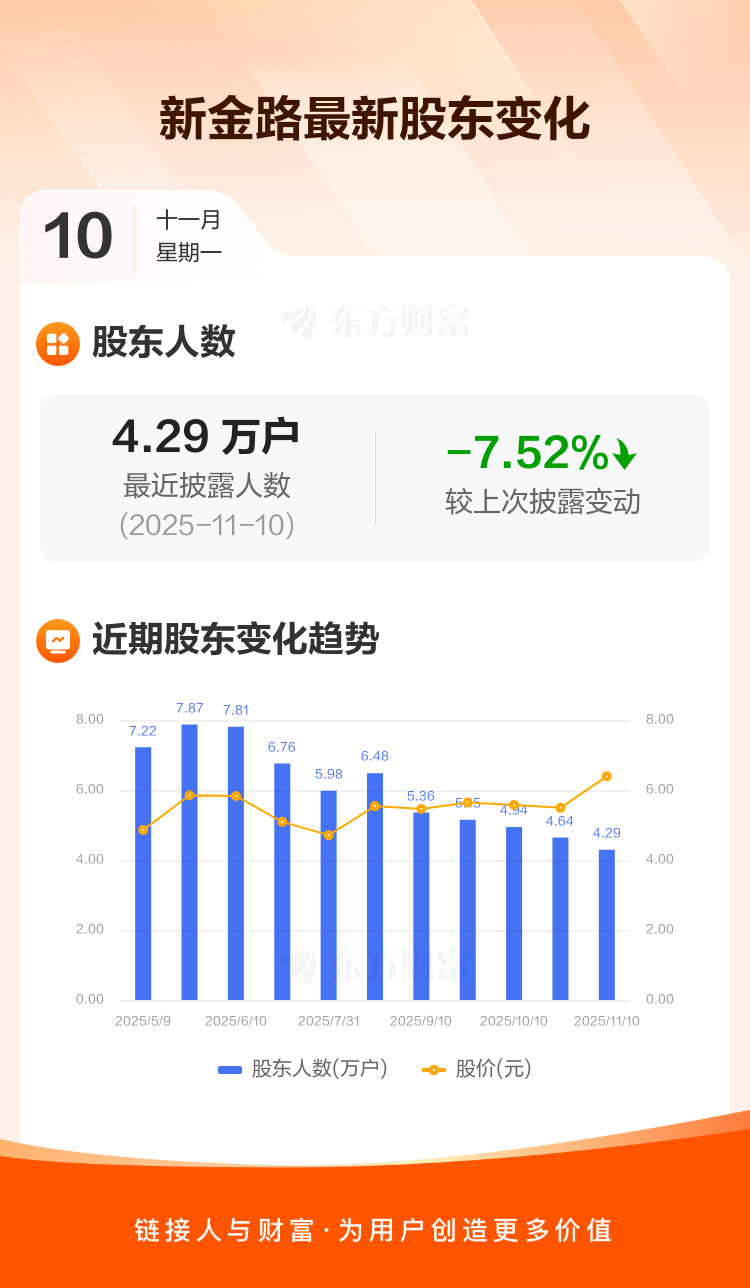 新金路最新披露数据显示,截至11月10日公司股东户数为4.29万户,较上期(2025年10月20日)减少3486户,降幅为7.52%。户均持有流通股数量由上期的1.31万股上升至1.42万股,户均持股金额由上期的7.18万元增加至9.04万元。