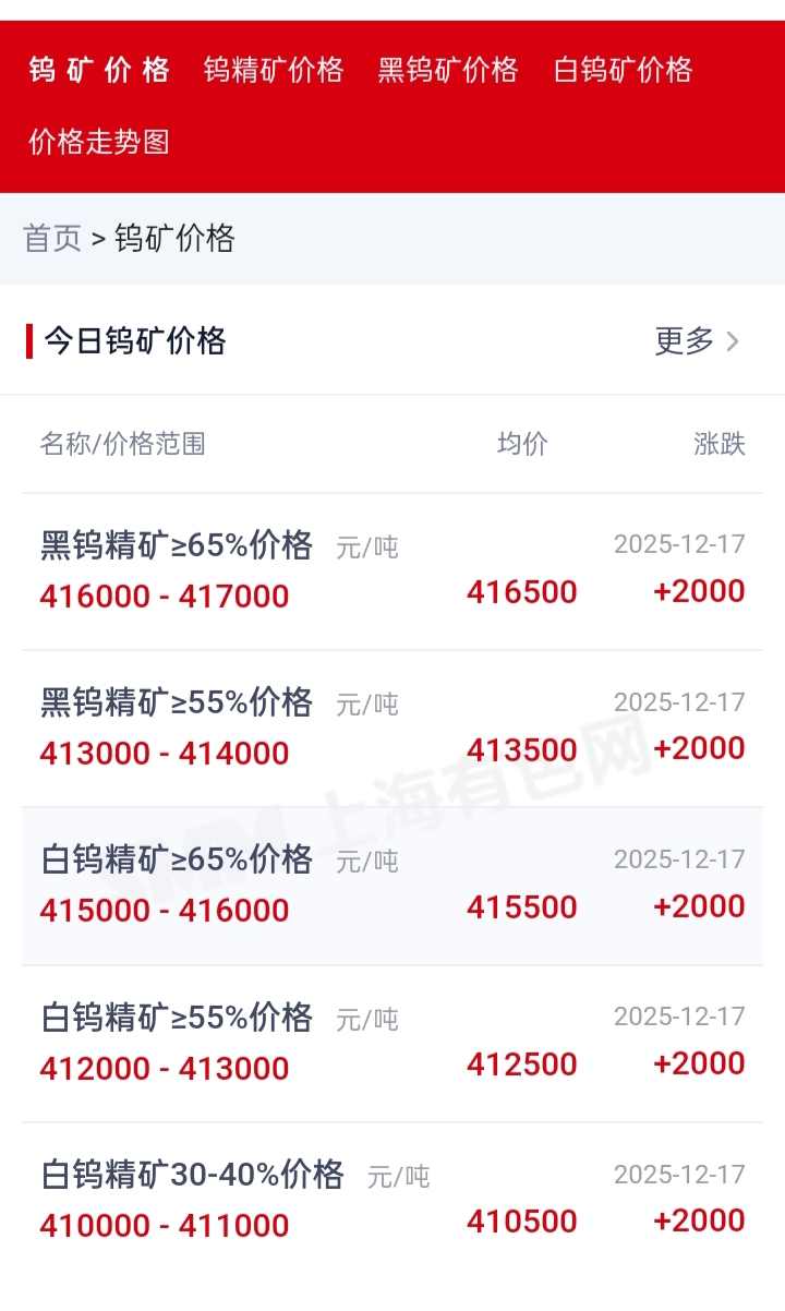 2025年12月17日中钨在线数据显示,钨粉价格上涨10元/千克,最新价格达到1000元/千克,较年初涨216.5%。当前钨