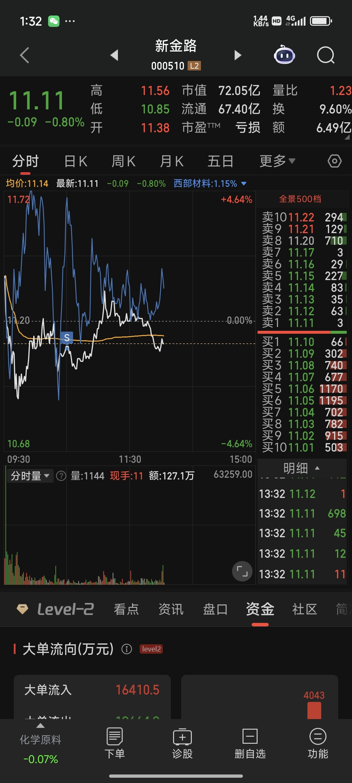 新金路今日(12月23日)高开低走,盘中下跌2.05%,报10.97元/股,成交