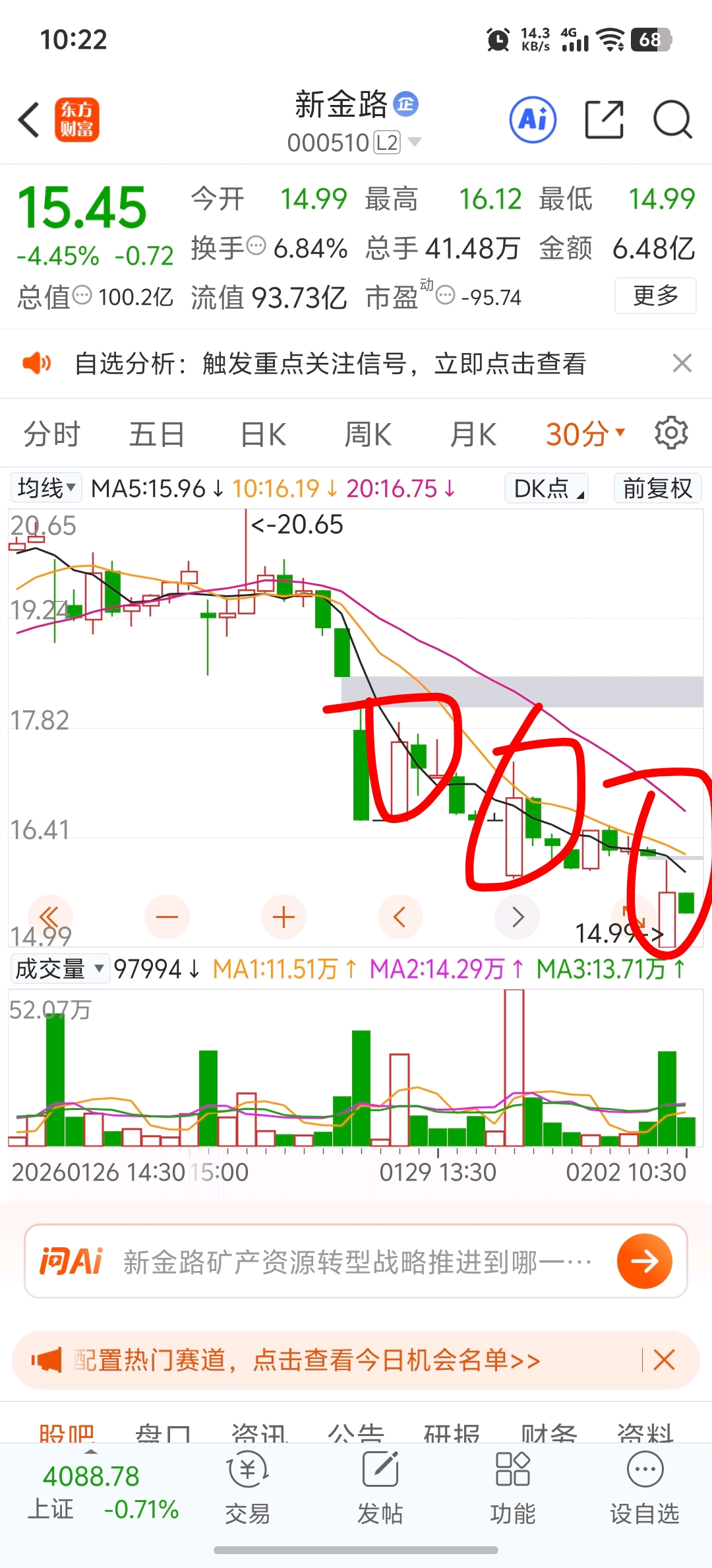 $新金路(SZ000510)$ 每天都是同一个套路,一根阳线上去,然后一直跌。