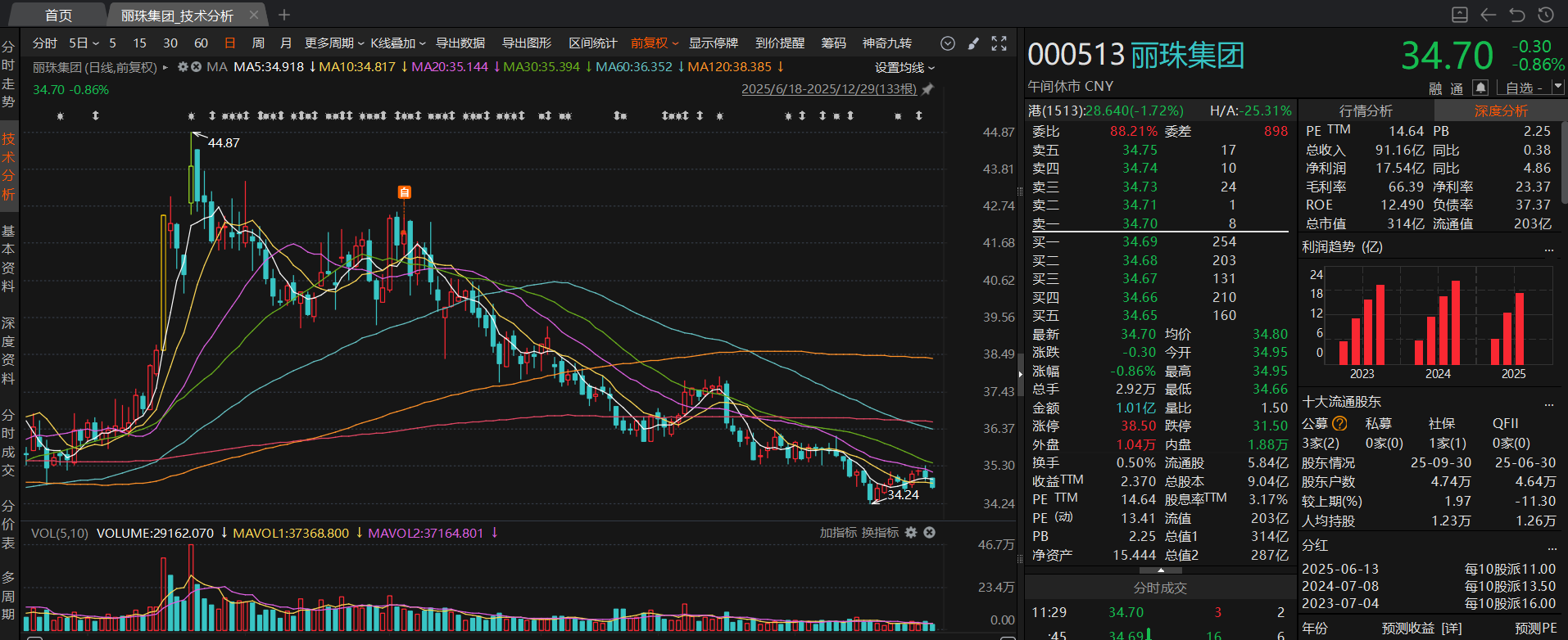 然而,该回购计划却未能挽救二级市场股价。数据显示,丽珠集团股价在7月22日触及44.87元/股的近一年高点后,便开启下行通道,截至2025年12月25日公告发布当日,收盘价仅为35.15元/股。