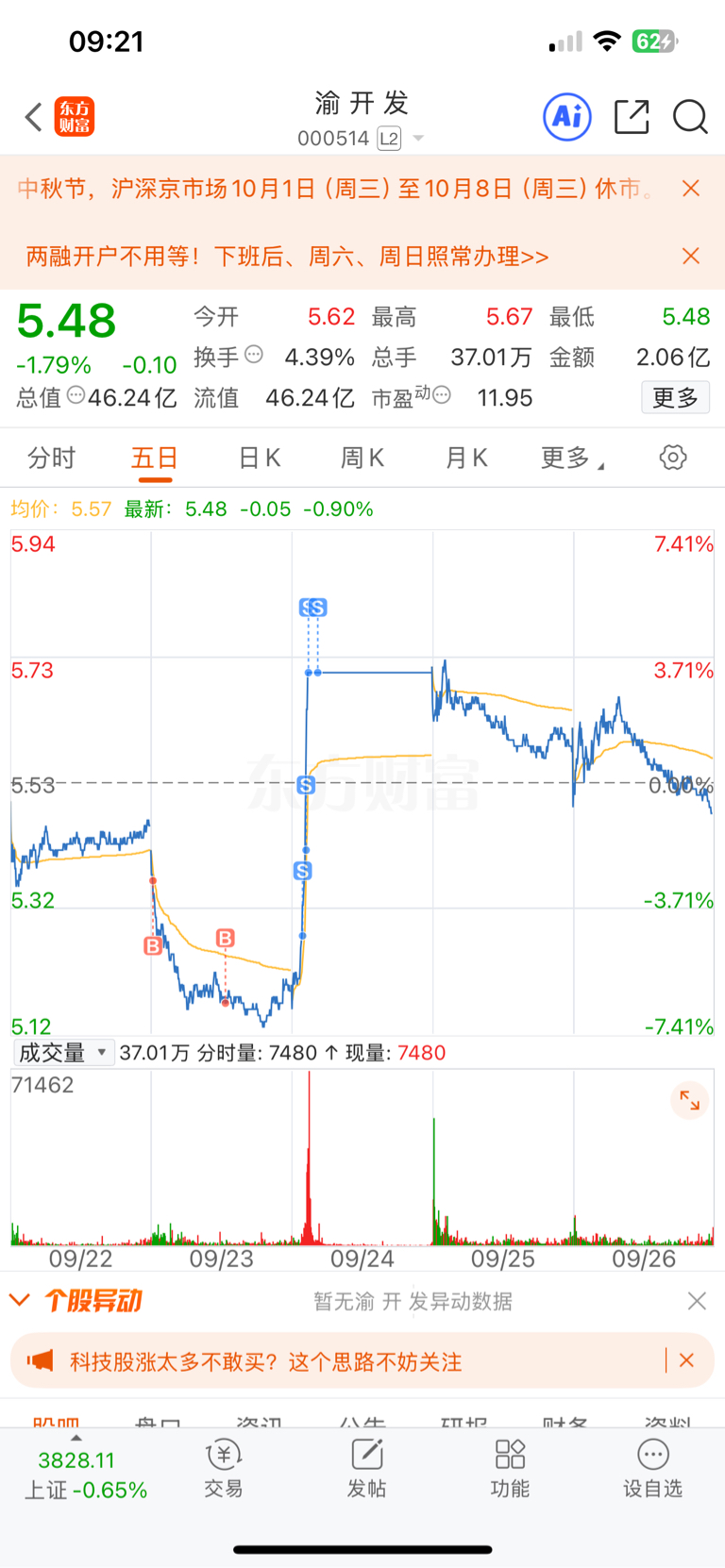 $渝 开 发(SZ000514)$ 上周五挂3.73元/20000股,没有成交。本周二补了10000股,周三涨停板30000股清仓了,盈利6000元。等待下跌至5.30元,逐渐建仓。