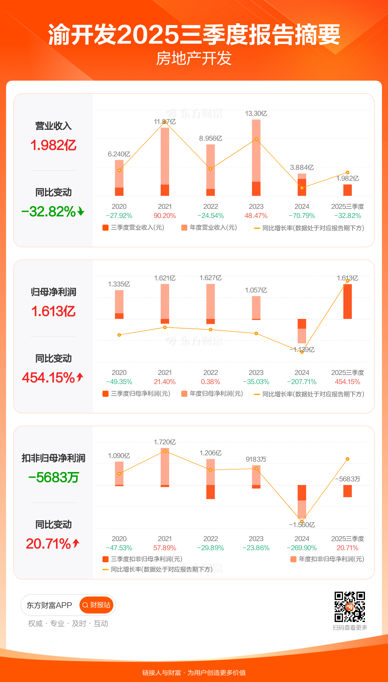 渝开发10月29日发布2025年三季报显示,公司前三季实现营业收入1.98亿元,同比下滑32.82%;归母净利润1.61亿元,同比增长454.15%;扣非归母净利润-5683.33万元。