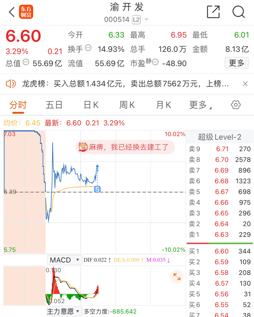 渝开发4个点跑了,太弱了,跟风杂毛抛了,换成新筑股份