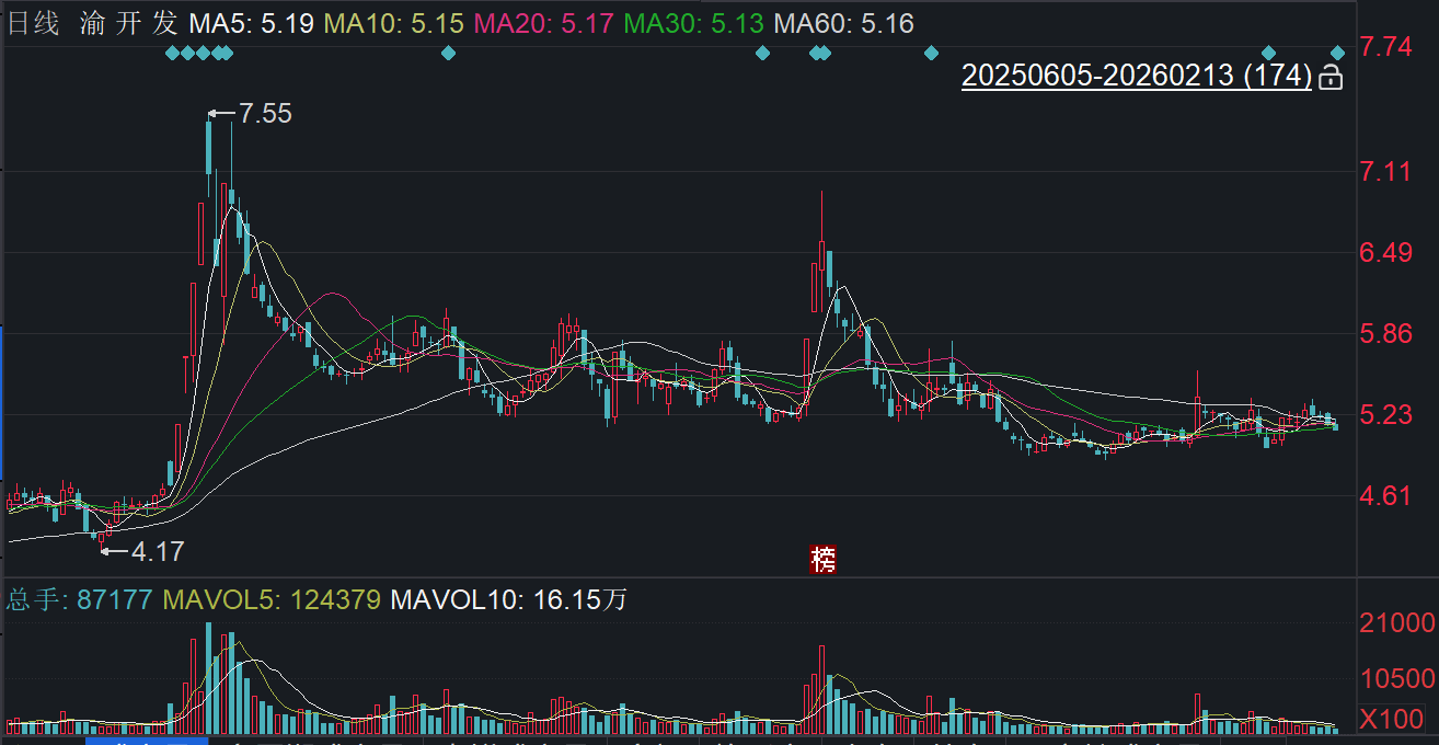 二级市场上,截至2月13日收盘,渝开发下跌0.97%报5.10元/股,总市值约43.03亿元,近一年来累计上涨近两成。