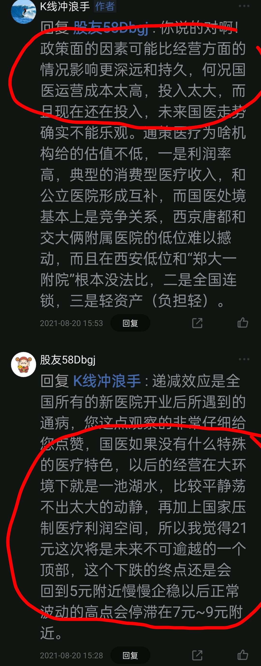 现在国医走成这样似乎让所有持仓的朋友始料不及,市值缩水惨重,肯定是有人后悔不已“为什么前面不跑?”等等,这个时候大家彼此彼此,更不能伤口上撒盐,不过还是应该反思反省一下,毕竟投资是个长期的事情,我在股吧还是重点关注了一些股友的发言,比如:这个截图(去年8月20日的帖子)里面的对话,其实还是有警惕性高抱着谨慎态度的股友,看看别人的思路,我想对我们其他股友都是和借鉴。