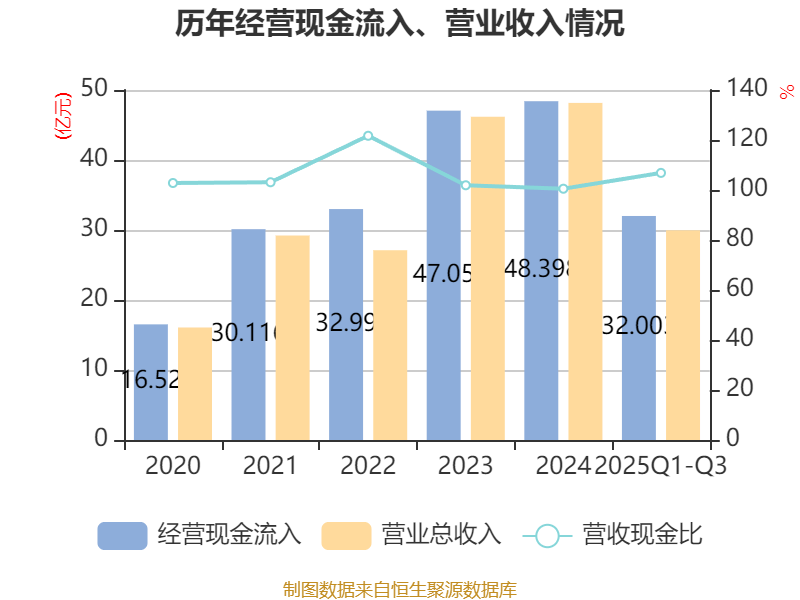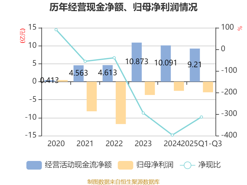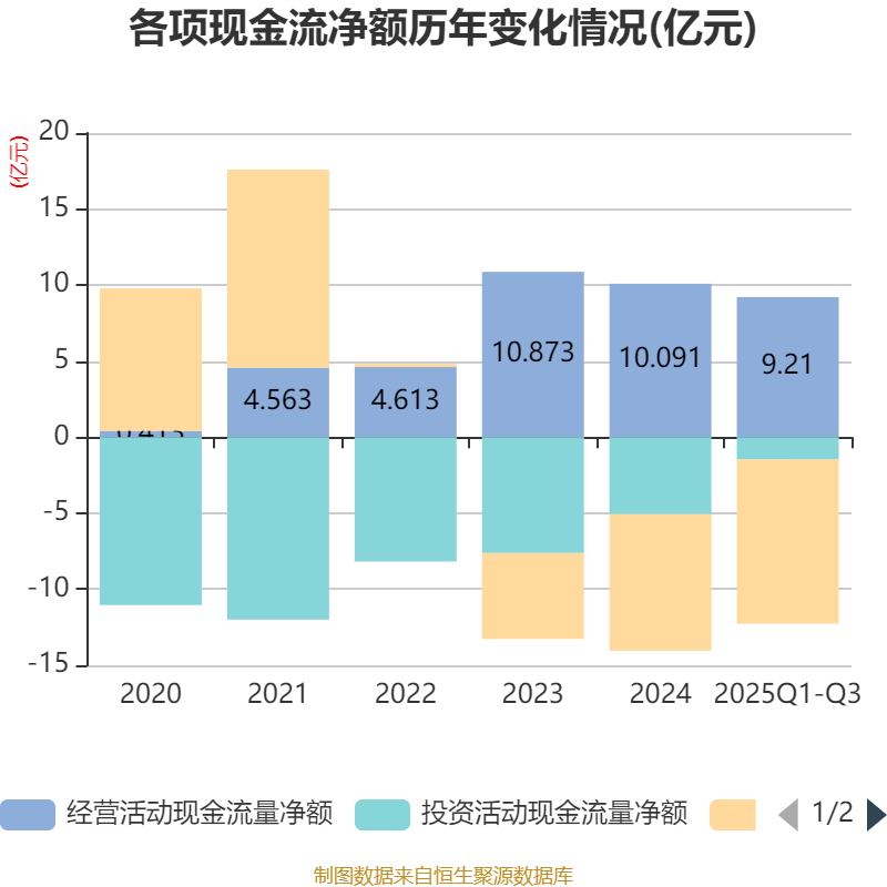 2025年前三季度,公司经营活动现金流净额为9.21亿元,同比增长47.67%;筹资活动现金流净额-10.79亿元,同比减少3.45亿元;投资活动现金流净额-1.47亿元,上年同期为-4.06亿元。